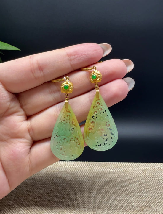 * DESIGN CONCEPT--- 18k Yellow Gold & Genuine Burmese Jadeite Jade Earrings With Diamonds and imperial jade. These earrings are made with high-quality genuine Yellow Green jadeite jade, The jadeite piece looks so clean and smooth without cracks or any dirty spots. And it's translucent like there is water inside. It means prosperity, good luck, and safety. The earrings look so lovely and exquisite. It's a perfect gift for yourself and your love.