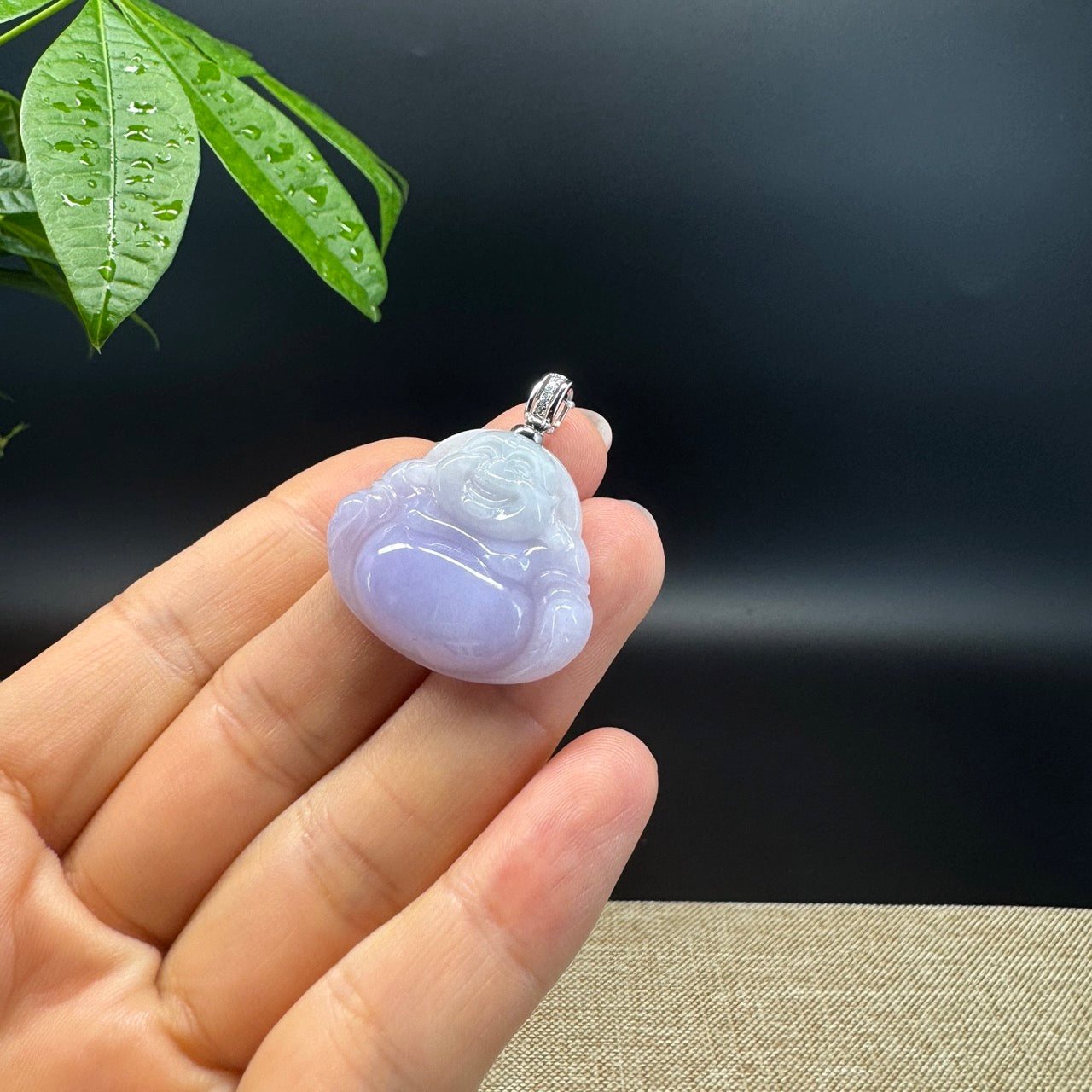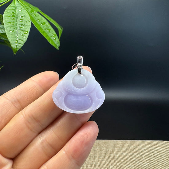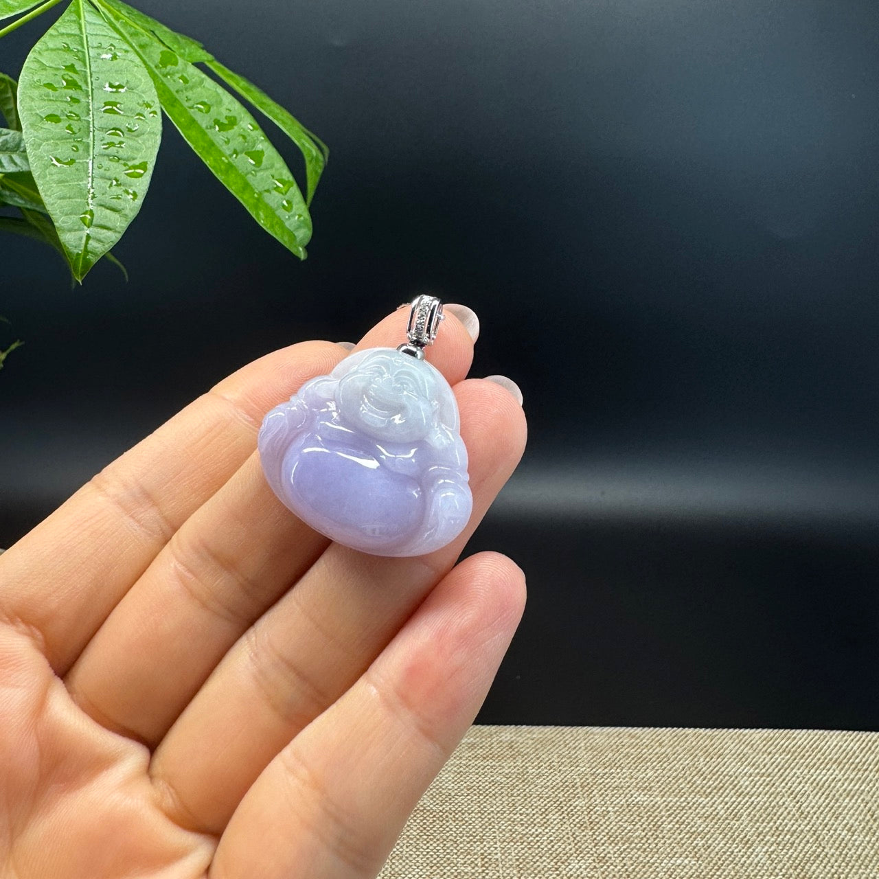 *INTRODUCTION---This lovely pendant is made from lavender jadeite jade, featuring a smooth and translucent texture. Expertly carved, and setting with 14k white gold diamond bail. Looks so simple and clear!  the Happy Buddha looks cheerful and inviting. Wearing this pendant is believed to attract positive energy and dispel negativity. The term "Buddha" means "enlightened one," representing guidance and protection. This pendant symbolizes prosperity, good luck, and wealth, making it a great accessory for everyday wear.