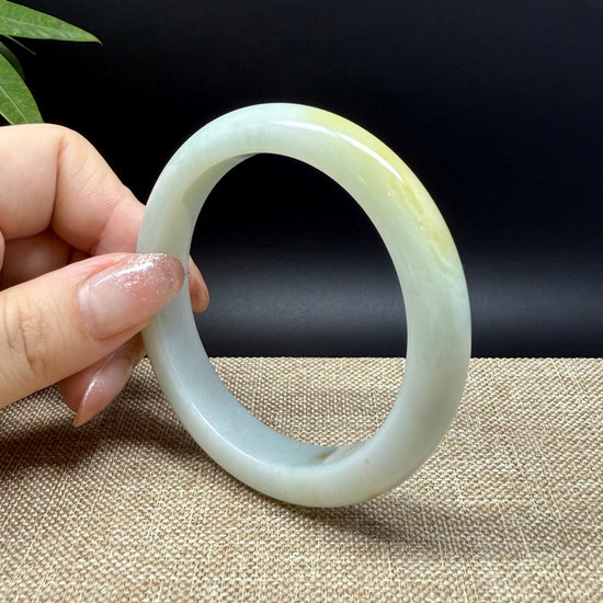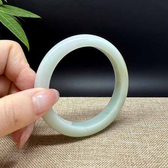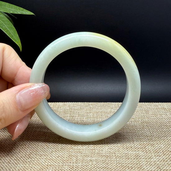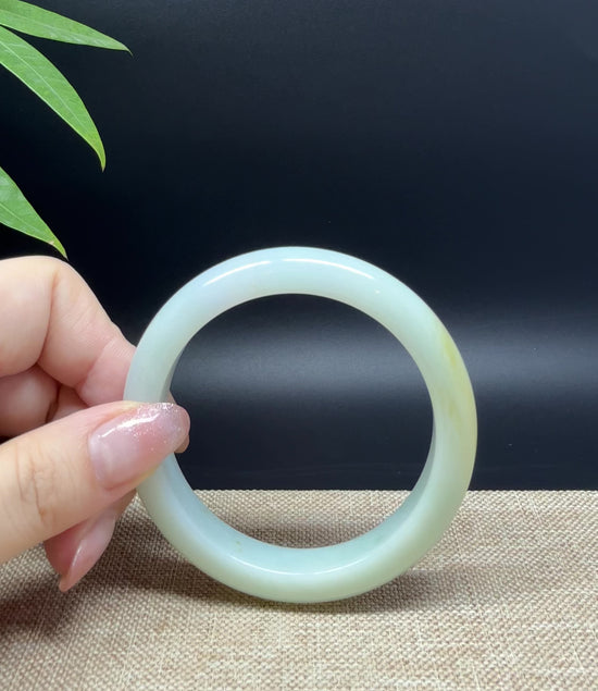 * DETAILS--- Genuine Burmese Jadeite Jade Bangle Bracelet. This exquisite Burmese jadeite bangle mesmerizes with its white blending light green with a touch of yellow. The half round shape offers both comfort and a perfect display of the jade’s natural beauty—a wearable treasure radiating elegance and cultural significance for the discerning collector.