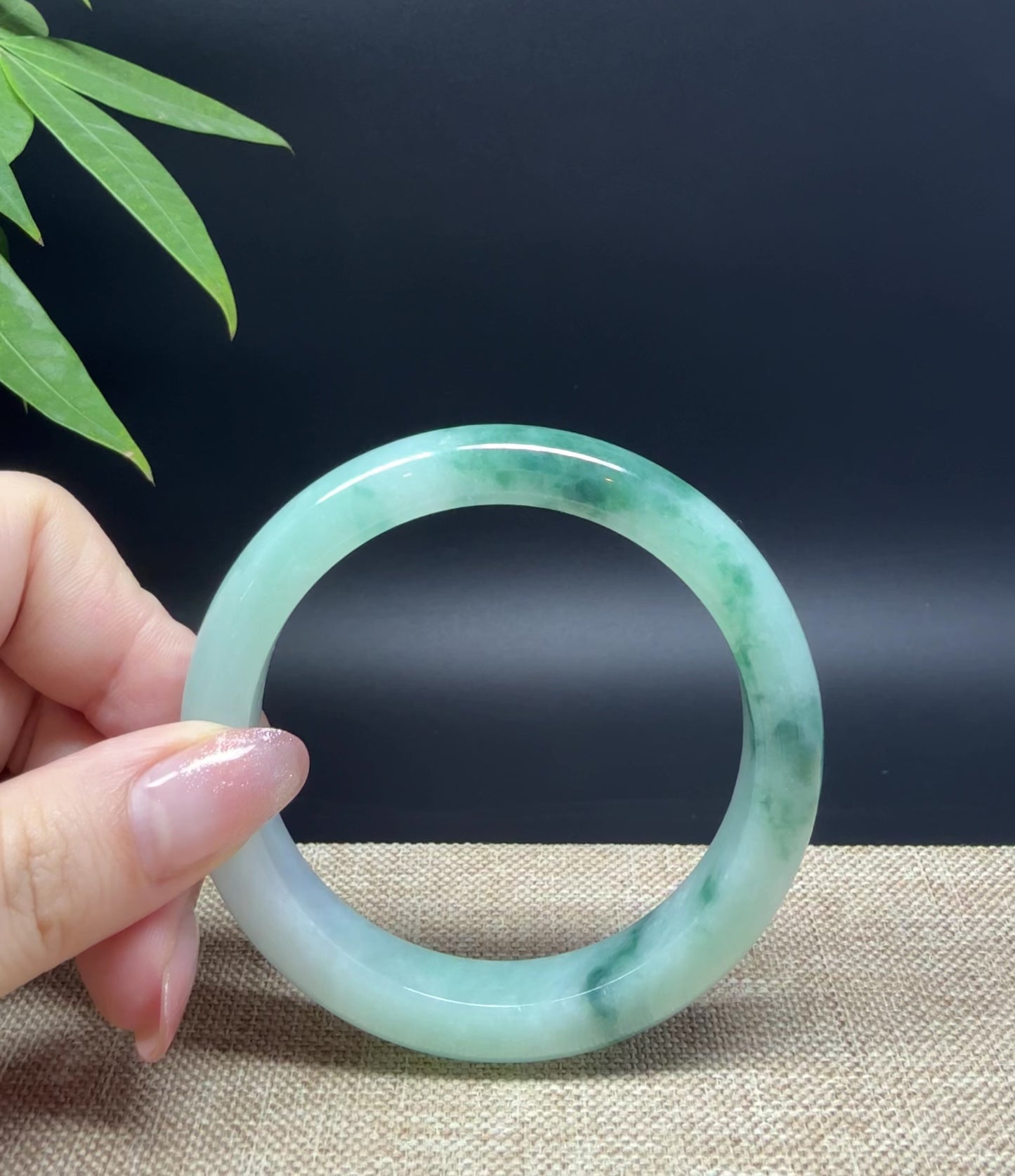 * DETAILS--- Genuine Burmese Jadeite Jade Bangle Bracelet. This bangle is made with very high-quality genuine Burmese Jadeite jade. The jade texture is fine and smooth with green base and some moss green flowers. The princess half round shape offers both comfort and suitable for people with petite hands. It's a unique gift for you and your love.