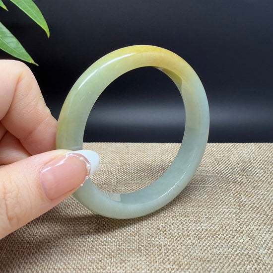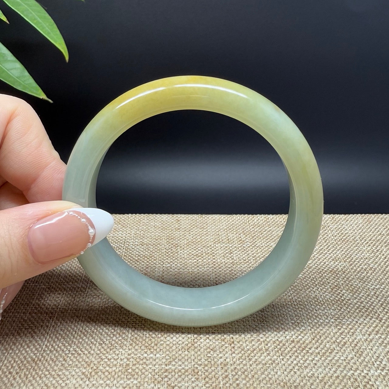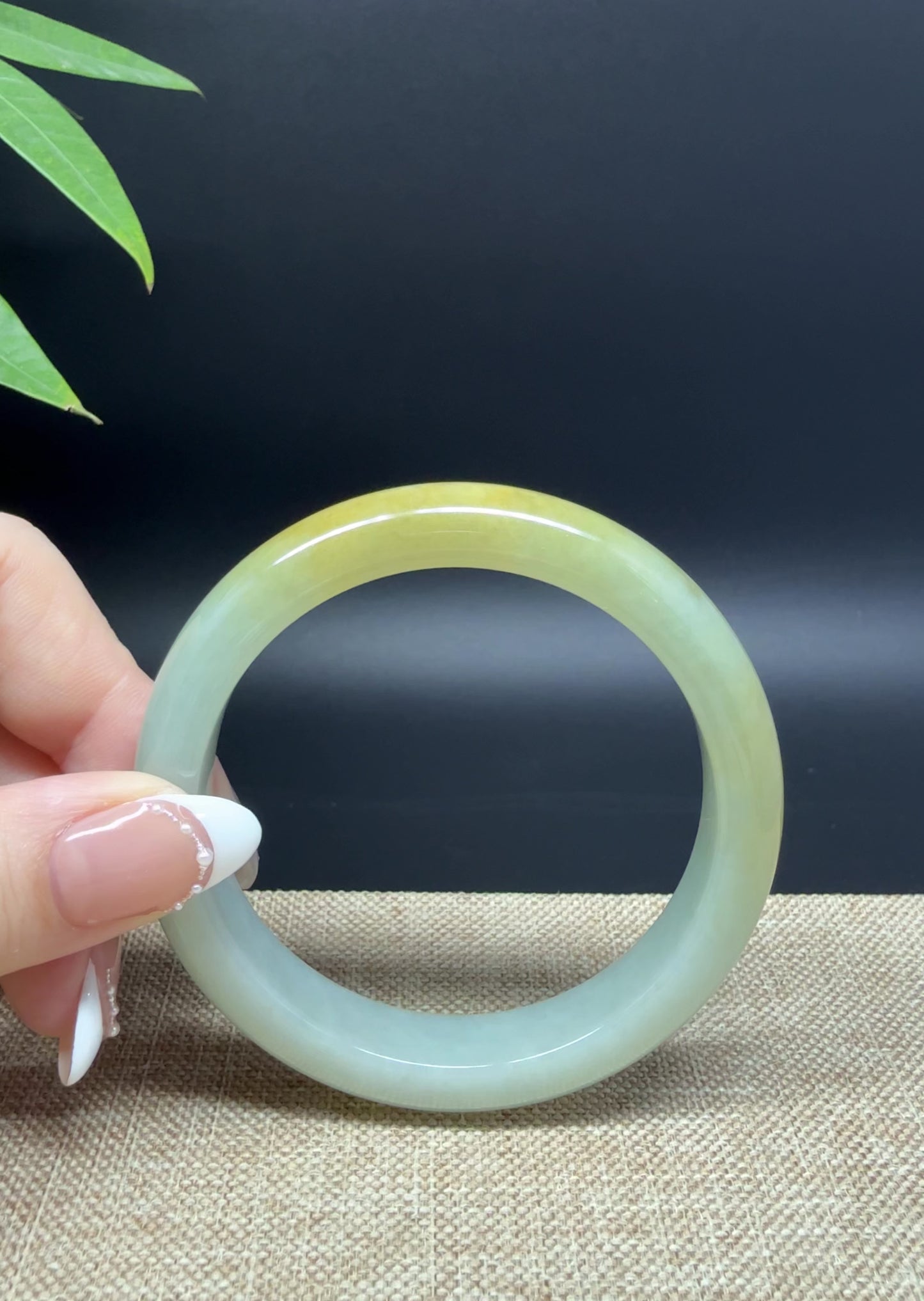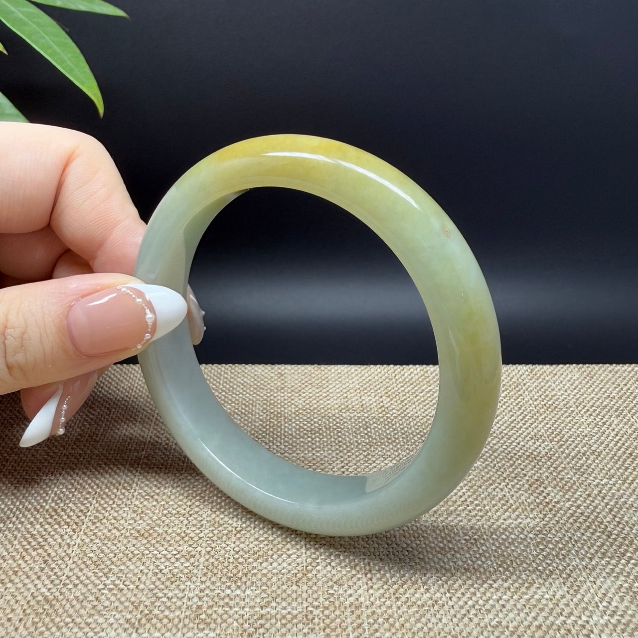 * DETAILS--- Genuine Burmese Jadeite Jade Bangle Bracelet. This bangle is made with very high-quality genuine Burmese Jadeite jade. The jade texture is fine and smooth with apple green base and a part of yellow. The half round shape offers both comfort and a perfect display of the jade’s natural beauty. It's a unique gift for you and your love.