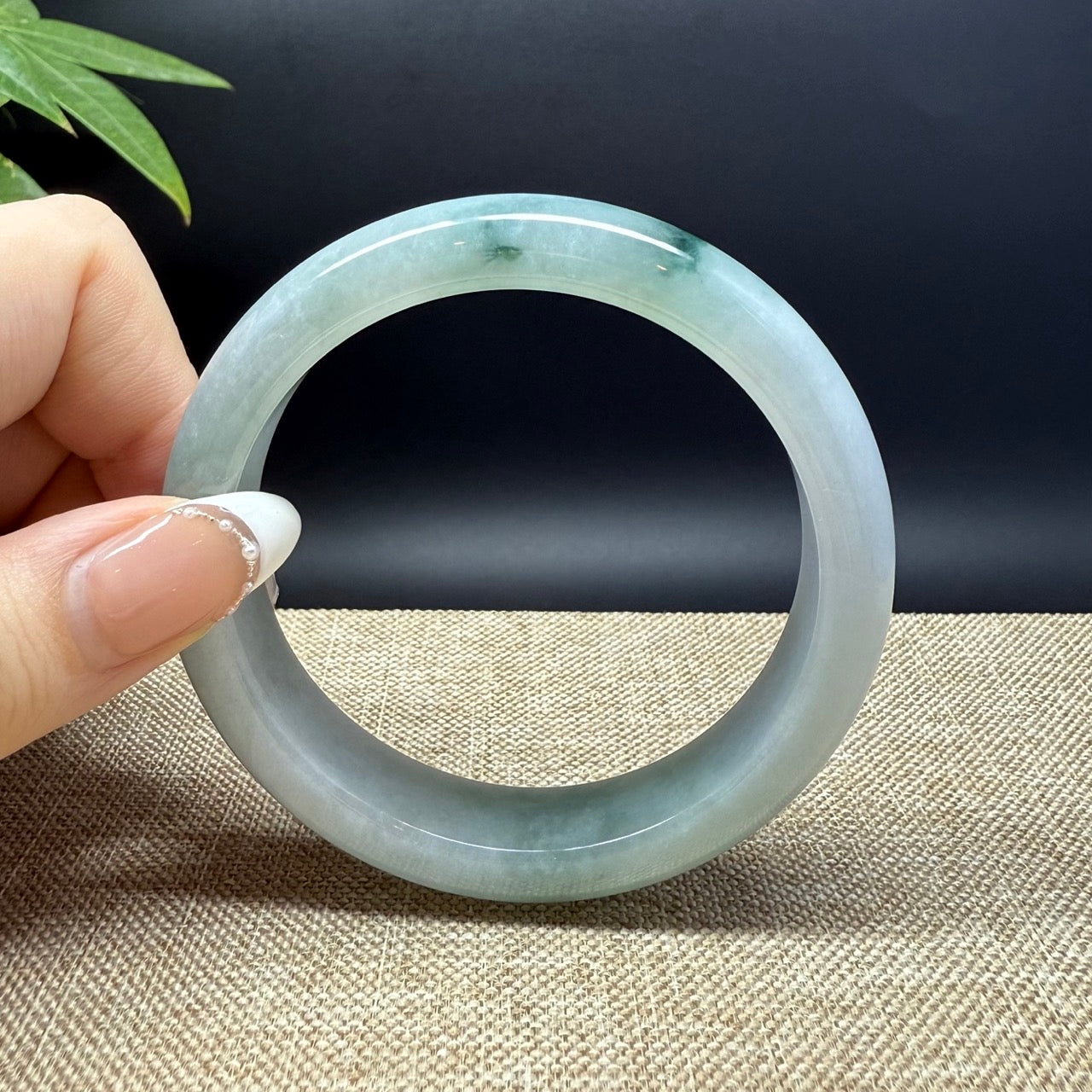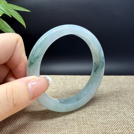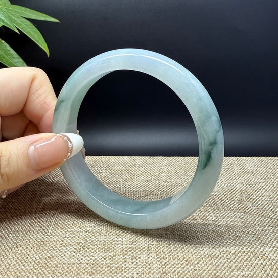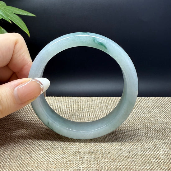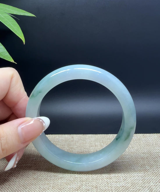 * DETAILS--- Genuine Burmese Jadeite Jade Bangle Bracelet. This bangle is made with very high-quality genuine Burmese Jadeite jade. The jade texture is fine and smooth with blue-white base and a little bit oil green flowers. The half round shape offers both comfort and a perfect display of the jade’s natural beauty. It's a unique gift for you and your love.