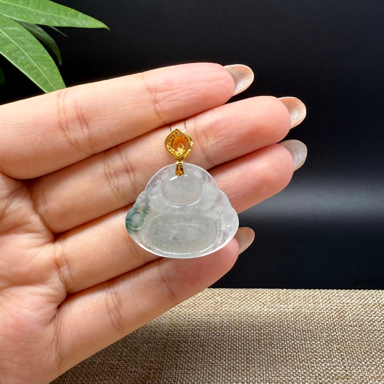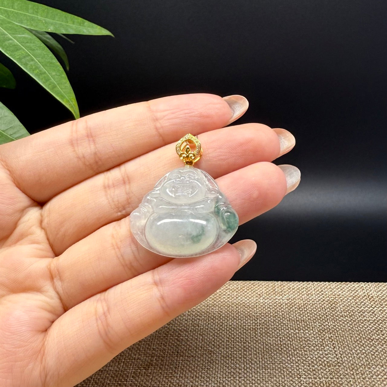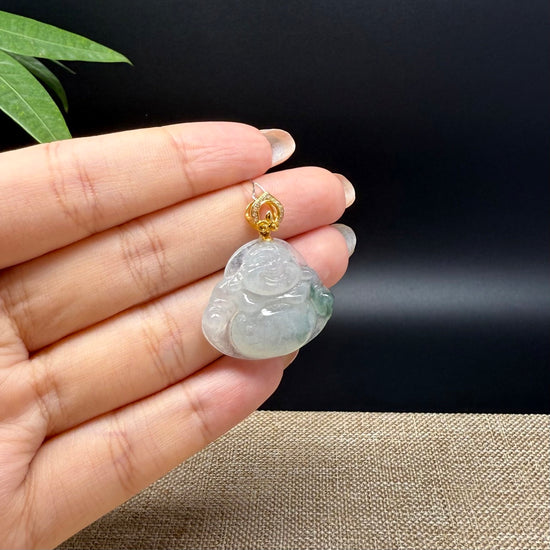 *INTRODUCTION---This exquisite necklace showcases vibrant green jadeite with a icy texture, elegantly encased with 18K yellow gold diamond bail. Expertly carved into a Happy Buddha, this pendant symbolizes joy, good luck, and prosperity, inviting happiness and positive energy to the wearer. A perfect blend of artistry and meaning, this piece is a delightful addition to any jewelry collection.