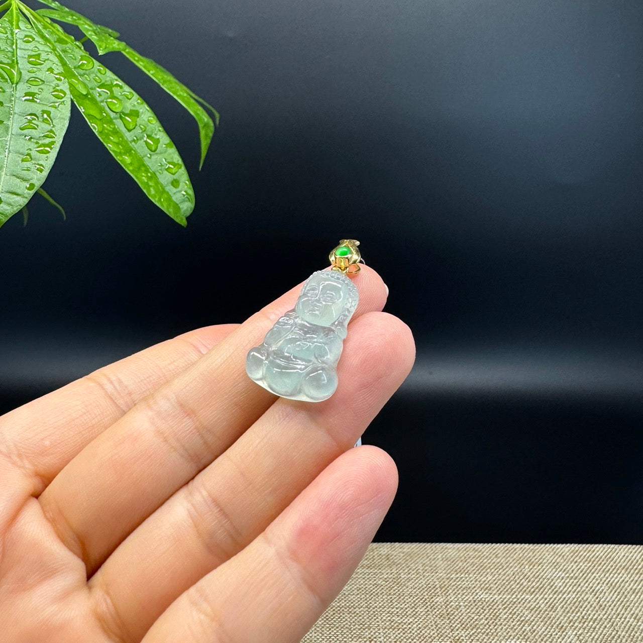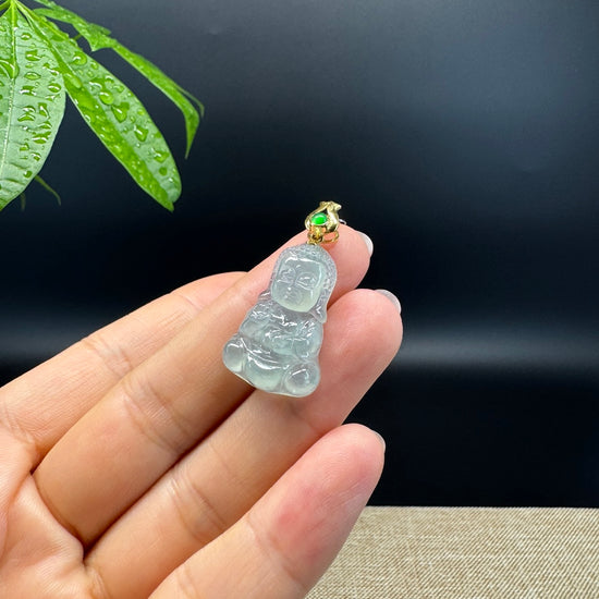 *INTRODUCTION---18k Yellow Gold & Genuine Green Jadeite Jade Buddha Pendant Necklace. The person who wears a Happy Buddha pendant around the neck attracts positive energy. They emit positive waves into the environment around them. The belief is all of the entire negativity is destroyed and a fighting spirit is generated within the person. The term Buddha literally means enlightened one, a knower to be a mentor to save and protect you. Representing prosperity, good luck, and wealth. Perfect everyday style.