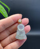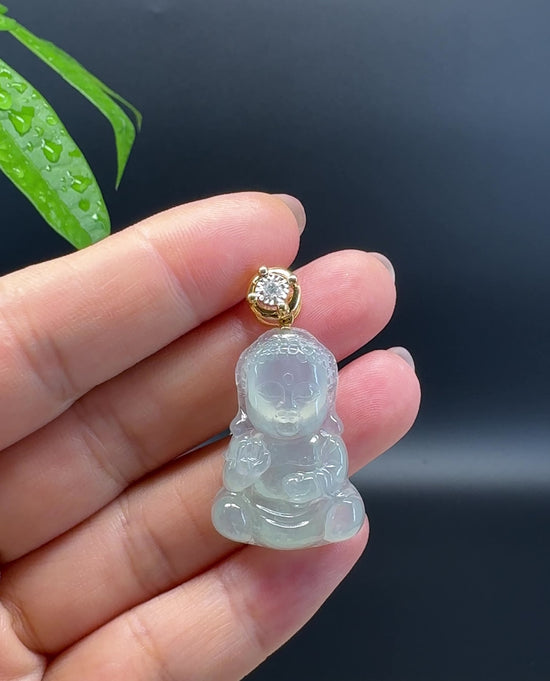 *INTRODUCTION---18k Yellow Gold & Genuine Icy Green Jadeite Jade Baby Buddha Pendant Necklace. The person who wears a Happy Baby Buddha pendant around the neck attracts positive energy. They emit positive waves into the environment around them. The belief is all of the entire negativity is destroyed and a fighting spirit is generated within the person. The term Baby Buddha literally means enlightened one, a knower to be a mentor to save and protect you. Representing prosperity, good luck, and wealth. Perfect everyday style.