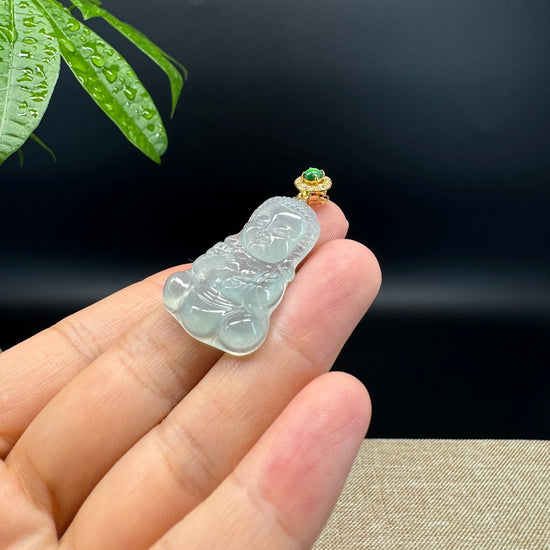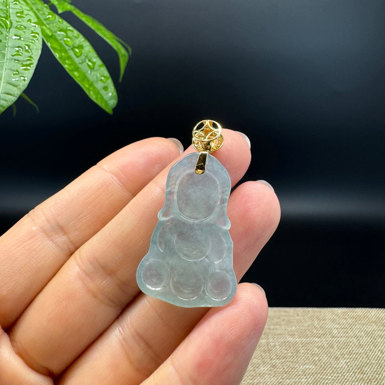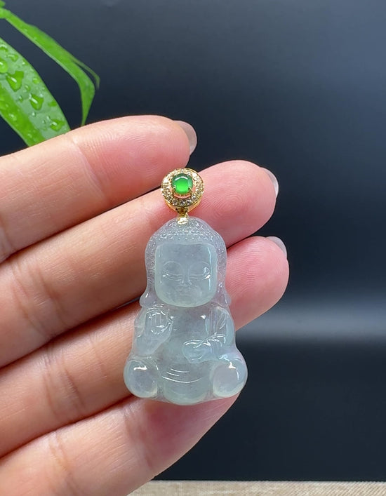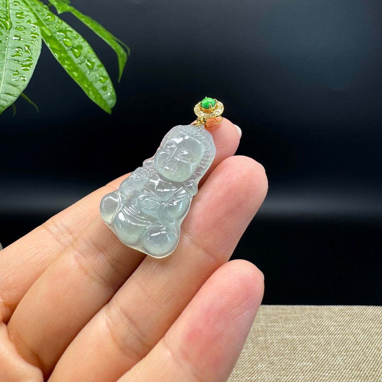 *INTRODUCTION---18k Yellow Gold & Genuine Icy Green Jadeite Jade Baby Buddha Pendant Necklace. The person who wears a Happy Baby Buddha pendant around the neck attracts positive energy. They emit positive waves into the environment around them. The belief is all of the entire negativity is destroyed and a fighting spirit is generated within the person. The term Baby Buddha literally means enlightened one, a knower to be a mentor to save and protect you. Representing prosperity, good luck, and wealth. Perfect everyday style.
