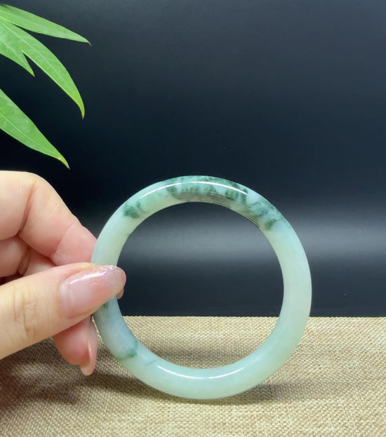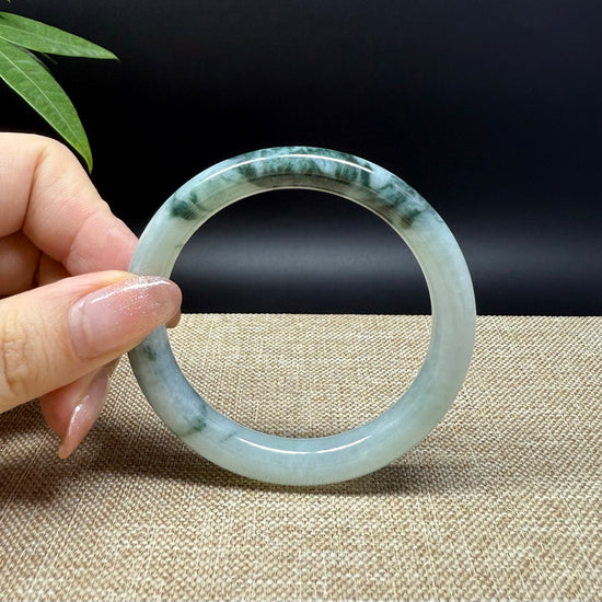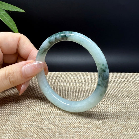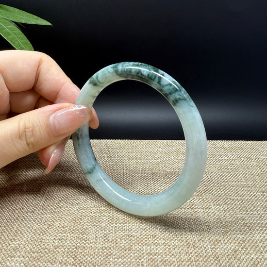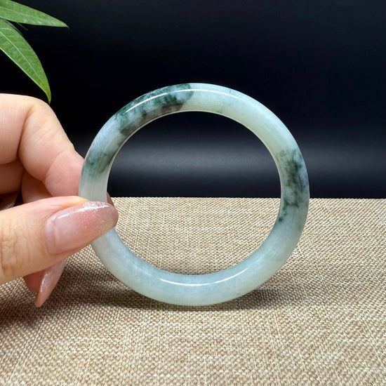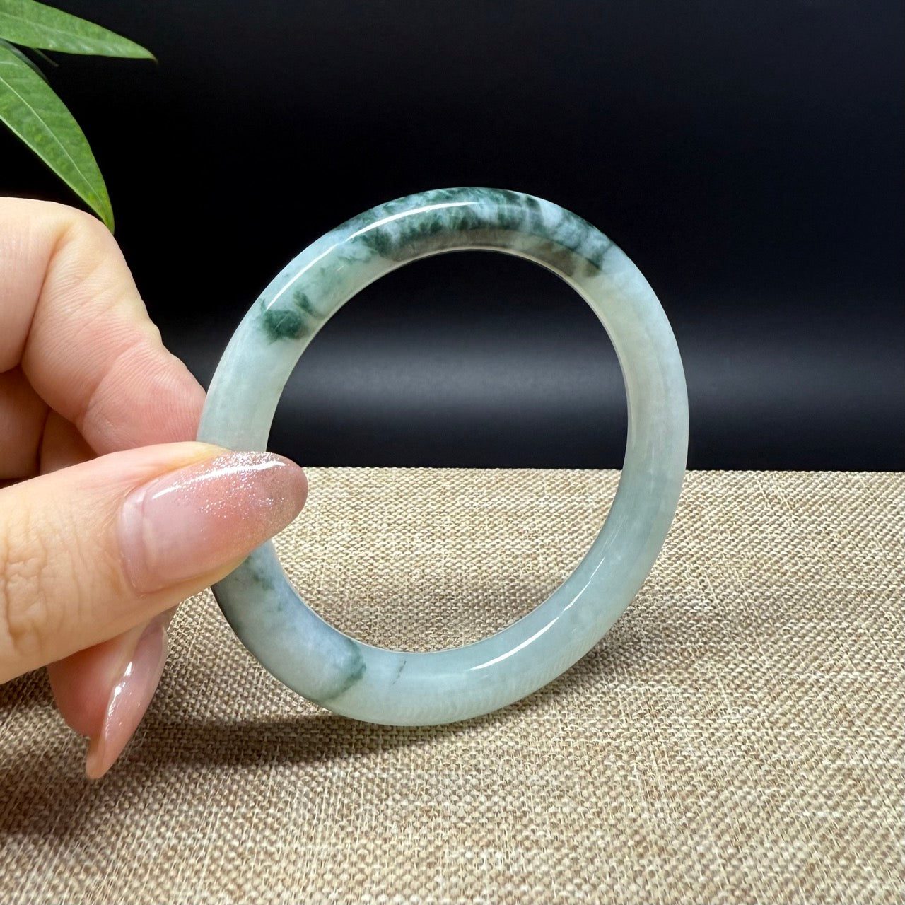 * DETAILS--- Genuine Burmese White Jadeite Jade Bangle Bracelet. This stunning bangle is made from fine Burmese jadeite, featuring soft white as the base with oil green flowers. The traditional round silhouette showcases nature's artistry in smooth, luxurious curves. A meaningful gift — perfect for yourself or someone truly special.