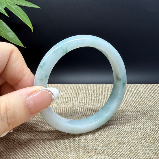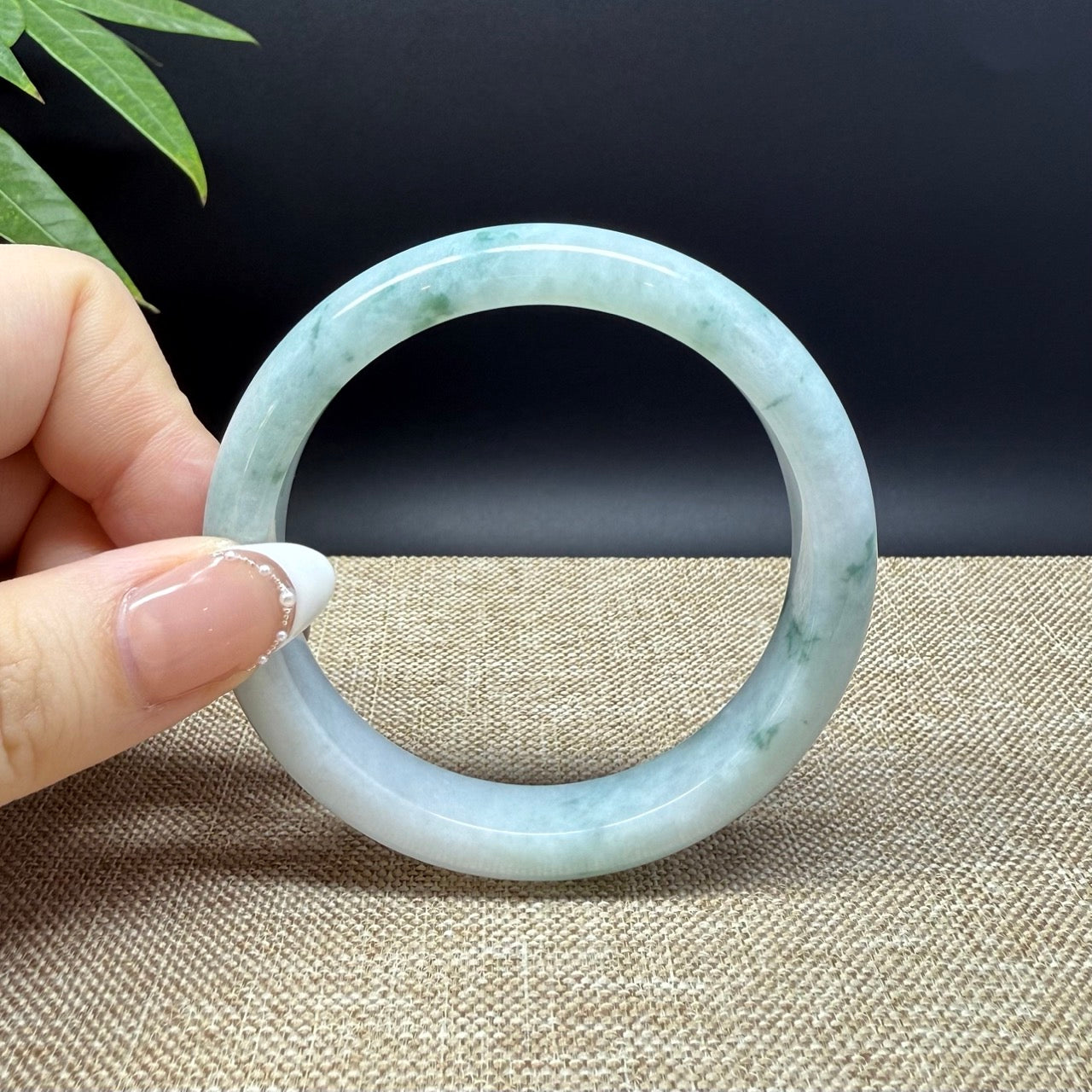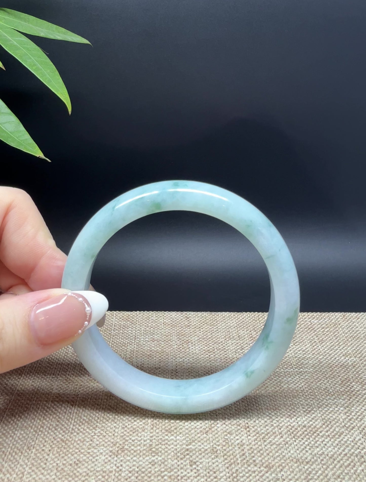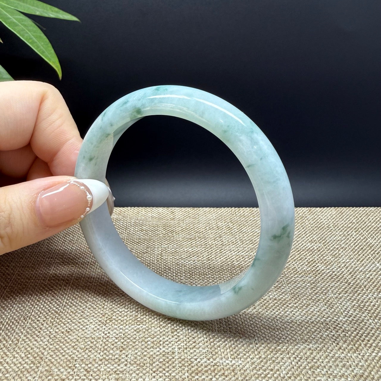 * DETAILS--- Genuine Burmese Jadeite Jade Bangle Bracelet. This bangle is made with very high-quality genuine Burmese Jadeite jade. The jade texture is fine and smooth with milky white base and a touch of green flowers. The half round shape offers both comfort and a perfect display of the jade’s natural beauty. It's a unique gift for you and your love.