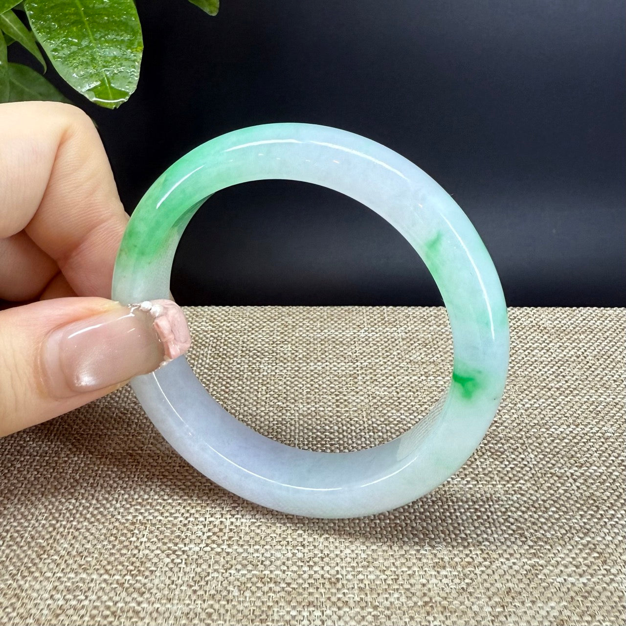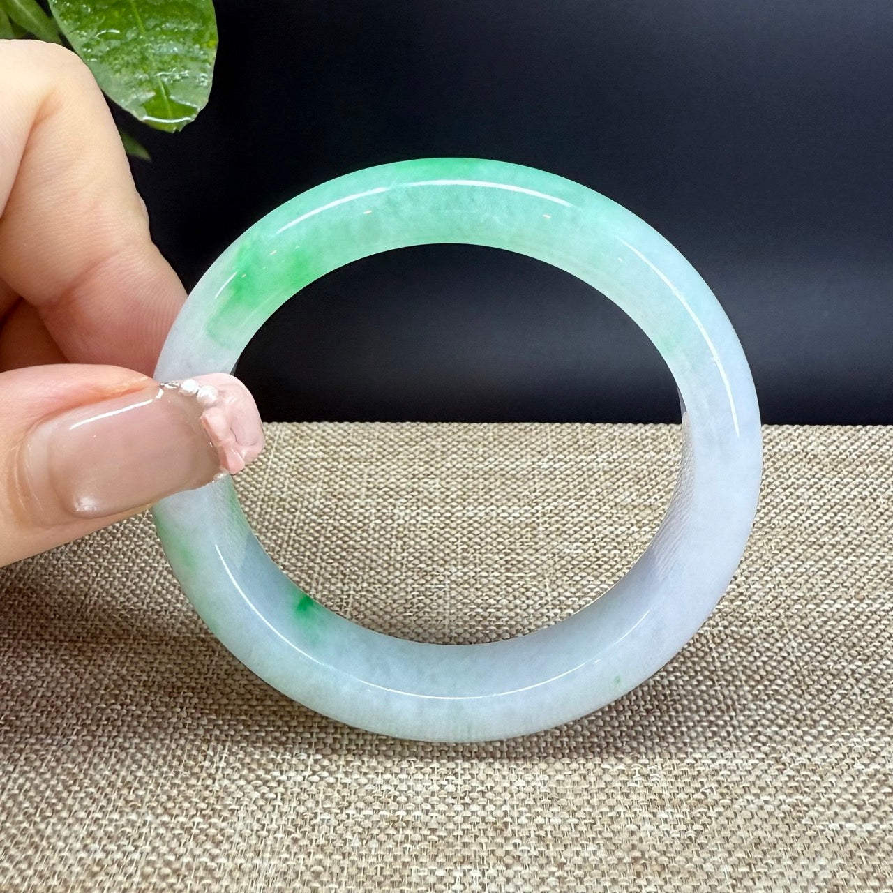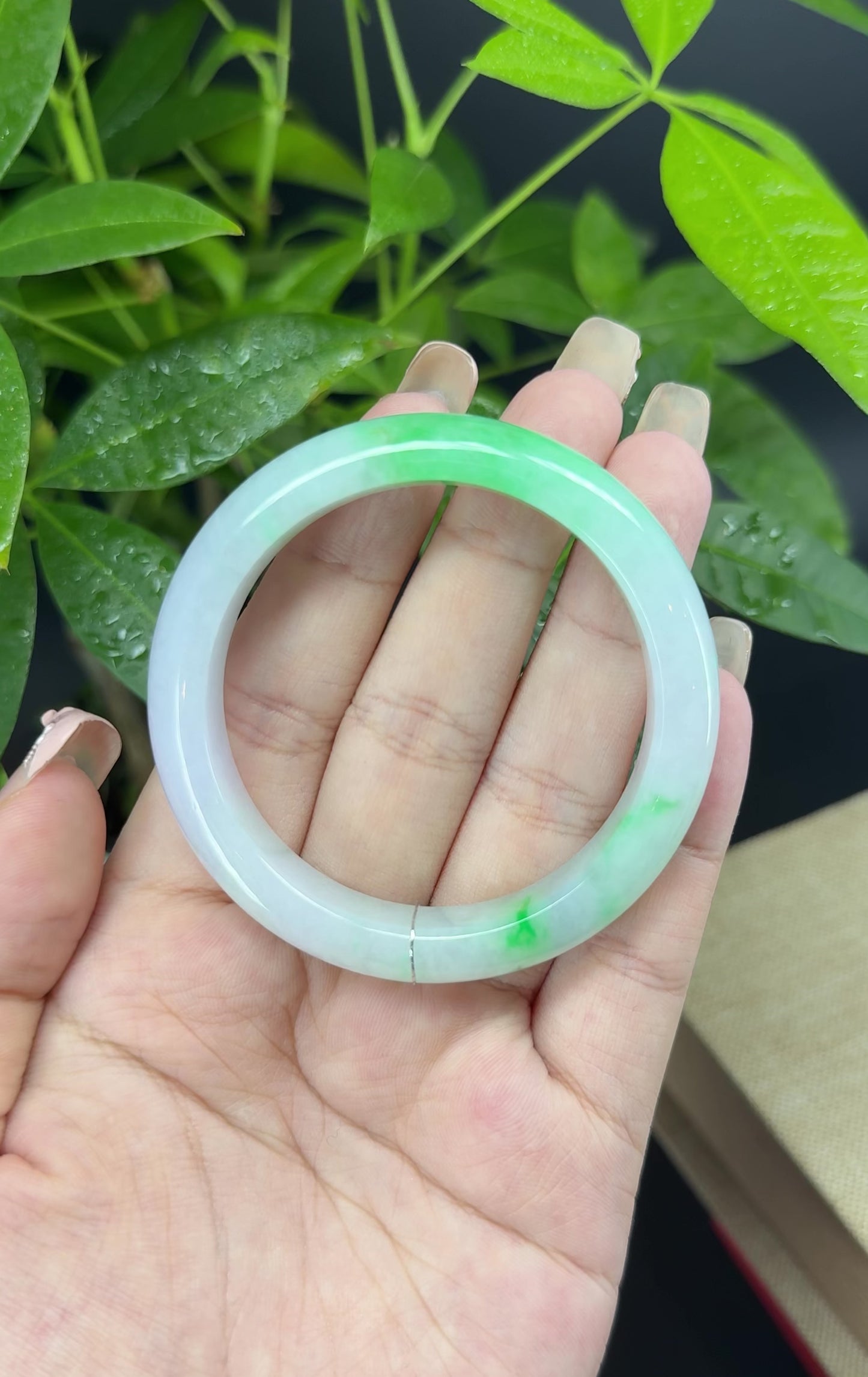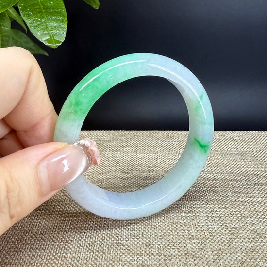 DETAILS--- Genuine Burmese Jadeite Jade Bangle Bracelet. This bangle is made from very high-quality natural Burmese jadeite jade. It has a smooth white base with beautiful green tones flowing through it. The vibrant green color and smooth, slightly translucent texture create a truly captivating look. Designed in a half-round comfort fit style, it feels comfortable to wear and looks elegant on the wrist. A refined and valuable piece, perfect for both beauty and investment.