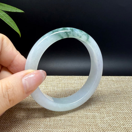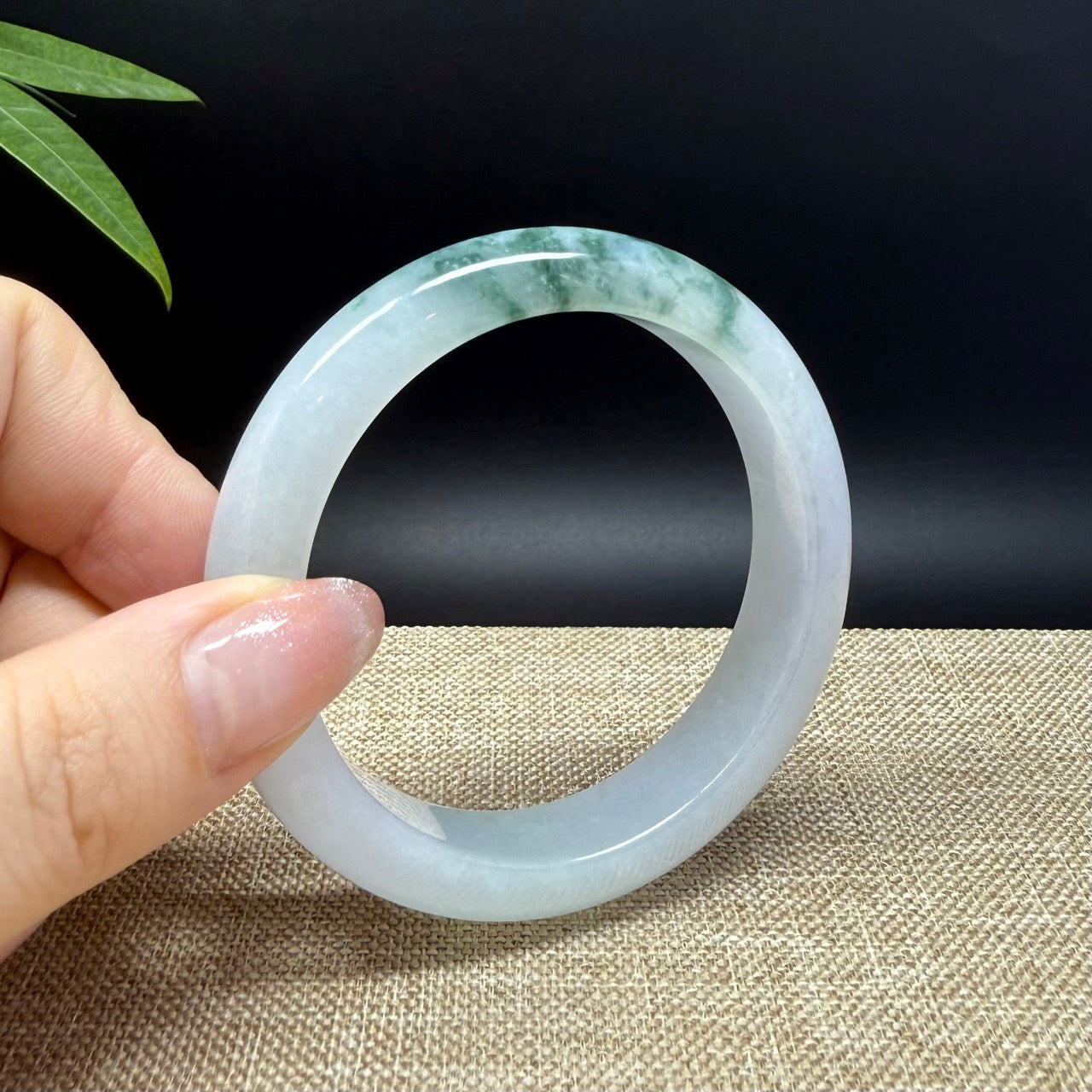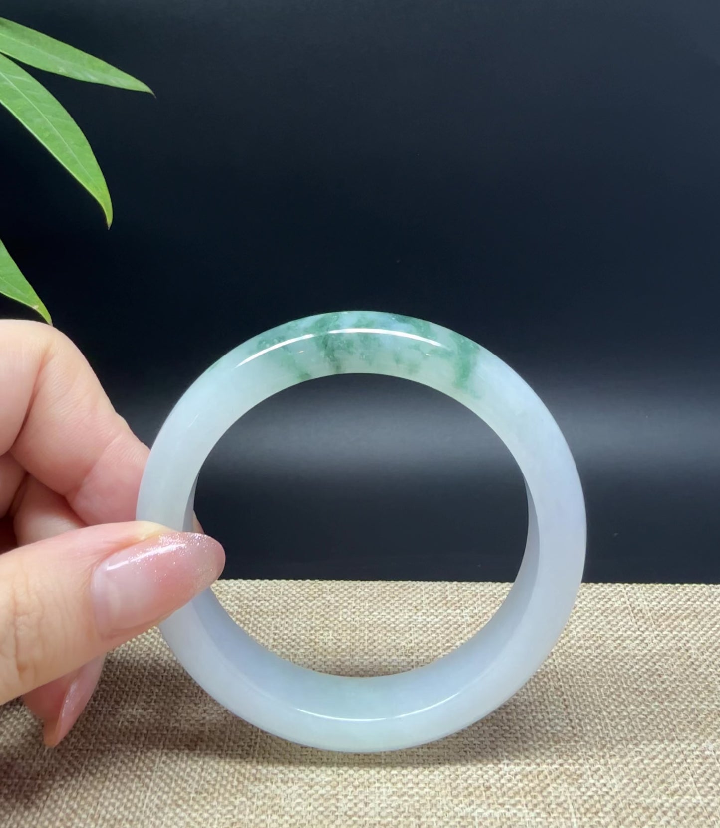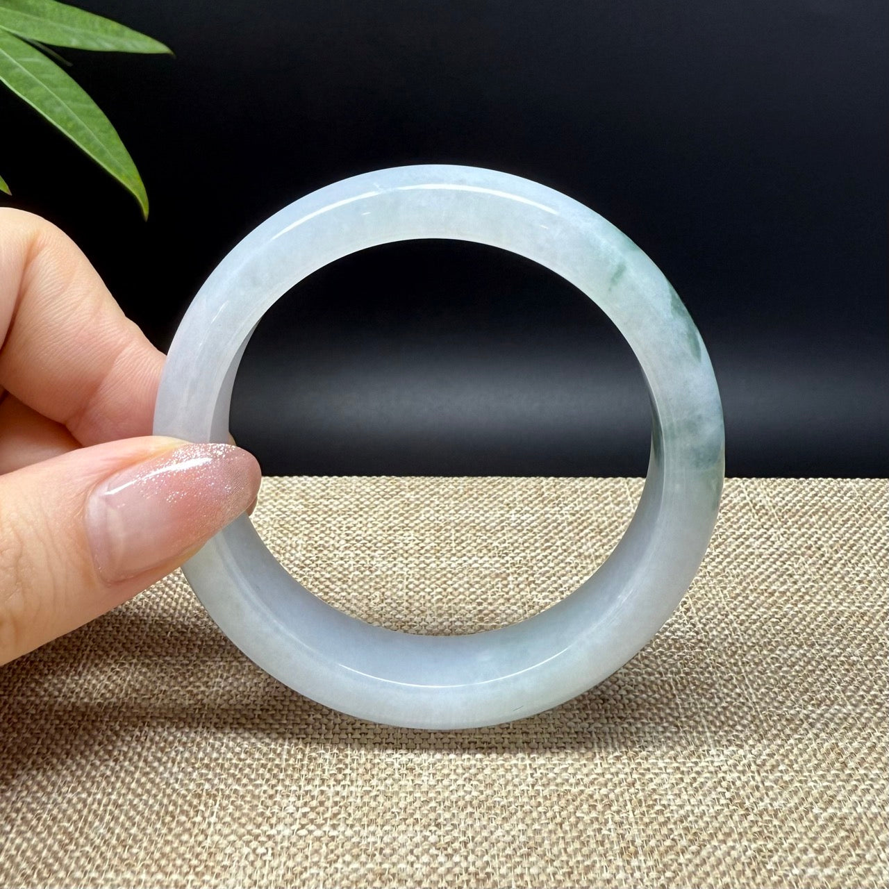 * DETAILS--- Genuine Burmese White Jadeite Jade Bangle Bracelet. This stunning bangle is made from fine Burmese jadeite, featuring milky white as the base with moss green flowers. The half round shape offers both comfort and a perfect display of the jade’s natural beauty. A meaningful gift — perfect for yourself or someone truly special.