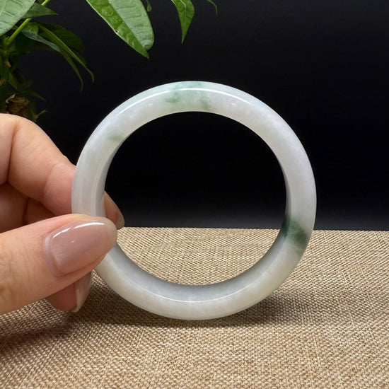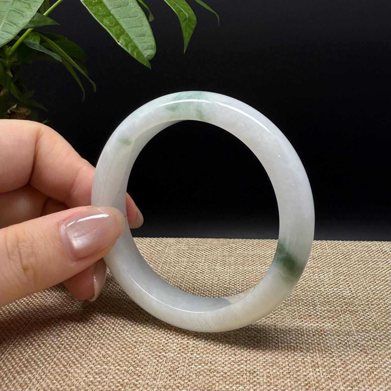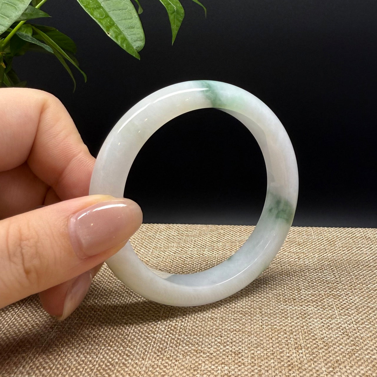 * DETAILS--- Genuine Burmese Jadeite Jade Bangle Bracelet. This Burmese jadeite bangle glows with ethereal pinky white hues and two oil green parts. Its smooth body flows like liquid silk in a perfect half-round embrace, capturing light with every graceful curve. A wearable sonnet where nature's pastel palette meets timeless craftsmanship - each glance reveals new depths of its poetic elegance.