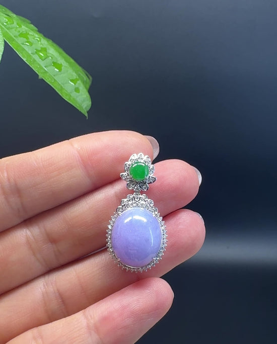 *Design concept-- This stunning pendant features high-quality Burmese lavender jadeite, renowned for its smooth texture and captivating full lavender hues. Set in 18K white gold and surrounded by sparkling diamonds, this larger cabochon jadeite piece exudes luxury and sophistication. A truly fashionable and collectible item, it is perfect for those seeking a distinctive addition to their jewelry collection.