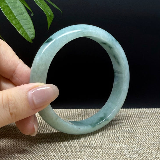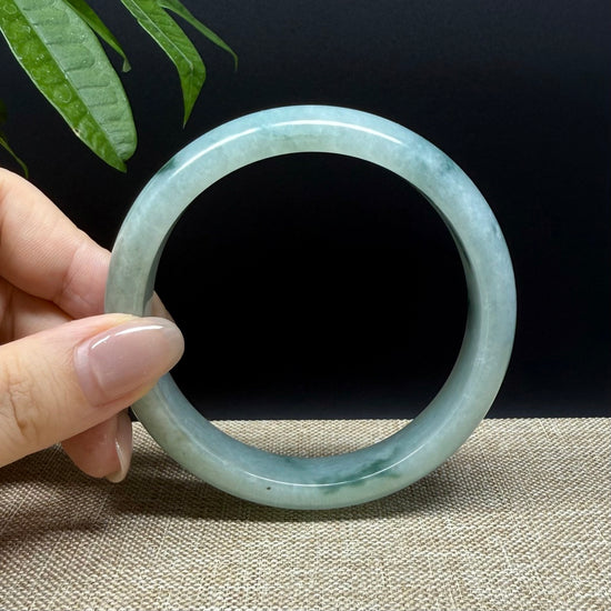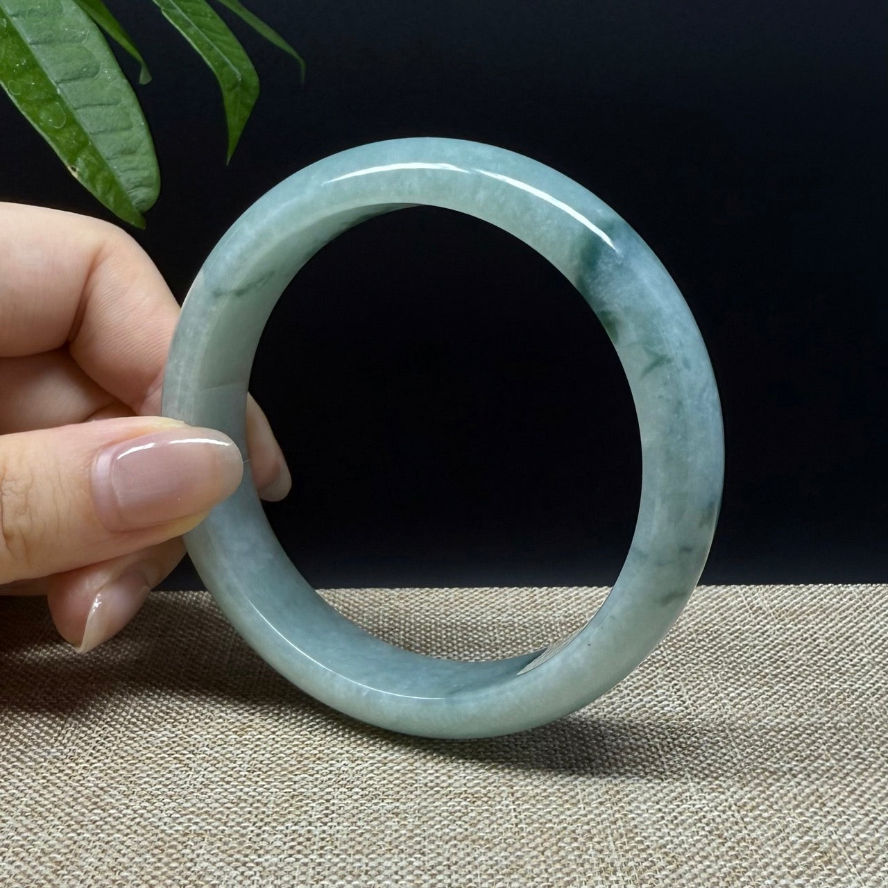 * DETAILS--- Genuine Burmese Jadeite Jade Bangle Bracelet. This bangle is made with very high-quality genuine Burmese Jadeite jade. The jade texture is translucent and smooth with blue green base and oil green flowers mix some yellow hue. The half round shape offers both comfort and a perfect display of the jade’s natural beauty. It's a unique gift for you and your love.