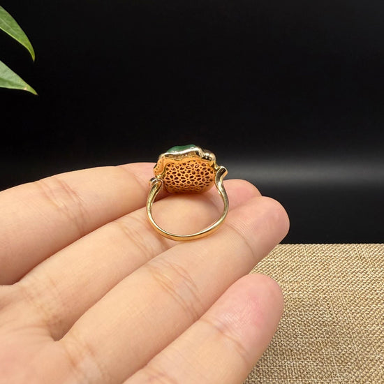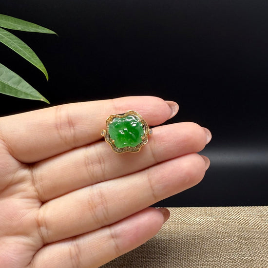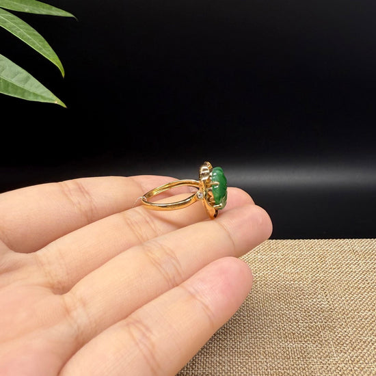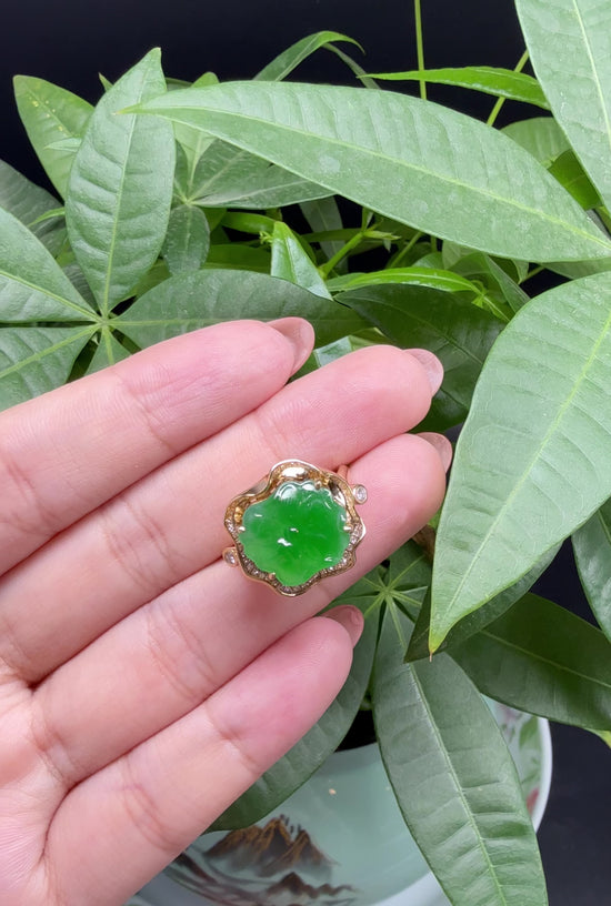 RealJade® "Signature Signet" 18K Yellow Gold Icy Green Jadeite Jade Lotus Leaf Ring