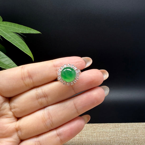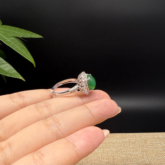 Design concept --- Inspired by the natural beauty of genuine Burmese green Jadeite jade. The rich, beautiful translucent green color is found on no other stone. This one-of-a-kind ring combines the natural beauty of the extremely rare gem with everyday luxury. Exquisite designs add details to admire and uniqueness to your everyday memento. It's a luxury ring for yourself and your love.