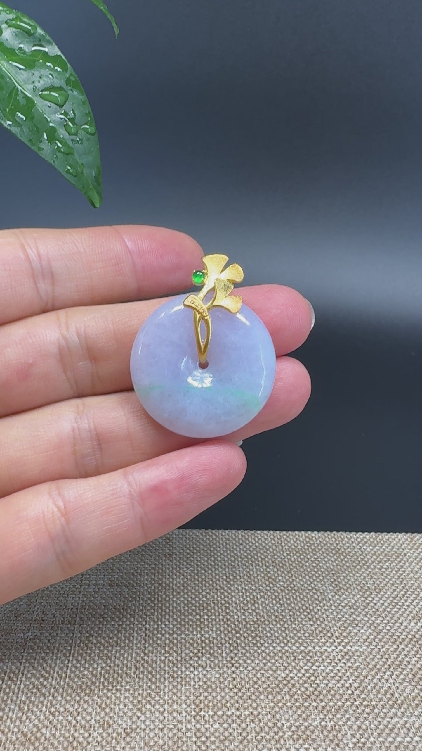 Design Concept--- The simple shape of a circle represents things such as happiness, wholeness, and prosperity. This necklace is made with very high-quality genuine Burmese green lavender jadeite jade. and made with 18K yellow solid gold apricot leaf bail with a small imperial jade. The texture is very smooth. Looks graceful. Gifting one of these is like wishing the best of luck to your family or loved ones. It's a meaningful gift.