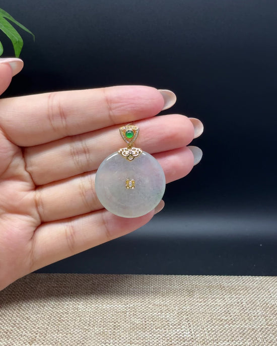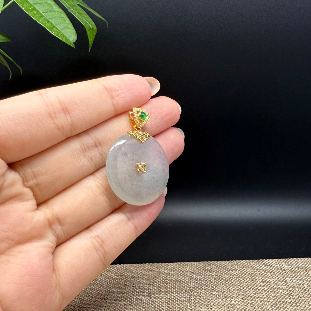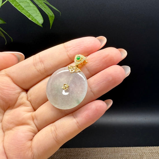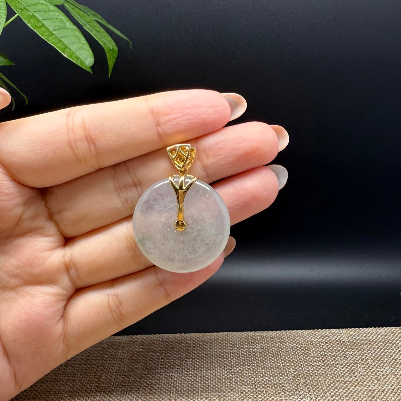 * Design Concept--- The simple shape of a circle represents things such as happiness, wholeness, and prosperity. This necklace is made with very high-quality genuine Burmese icy green jadeite jade. and made with 18K yellow gold bail with a small imperial jade. The texture is very smooth and ice. Looks so graceful. Gifting one of these is like wishing the best of luck to your family or loved ones. It's a meaningful gift.