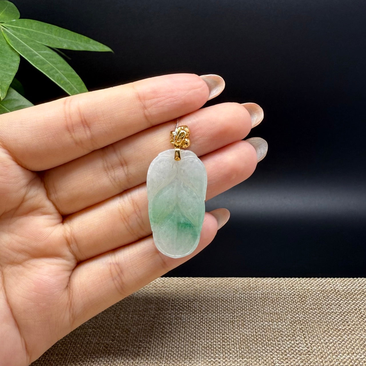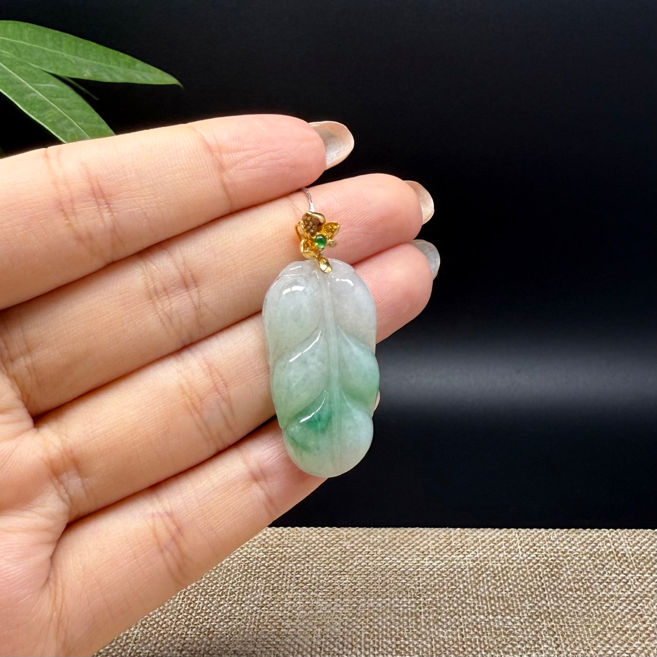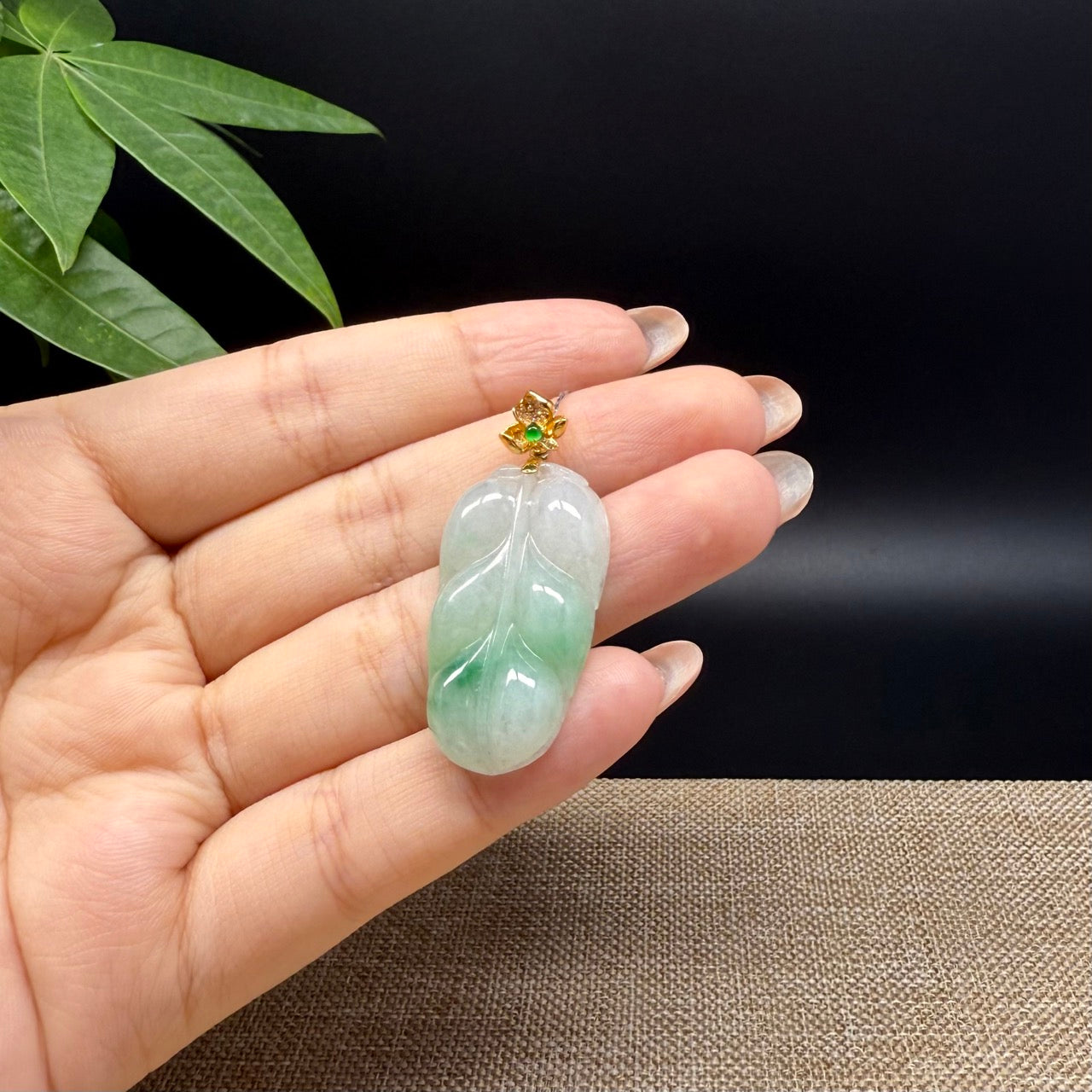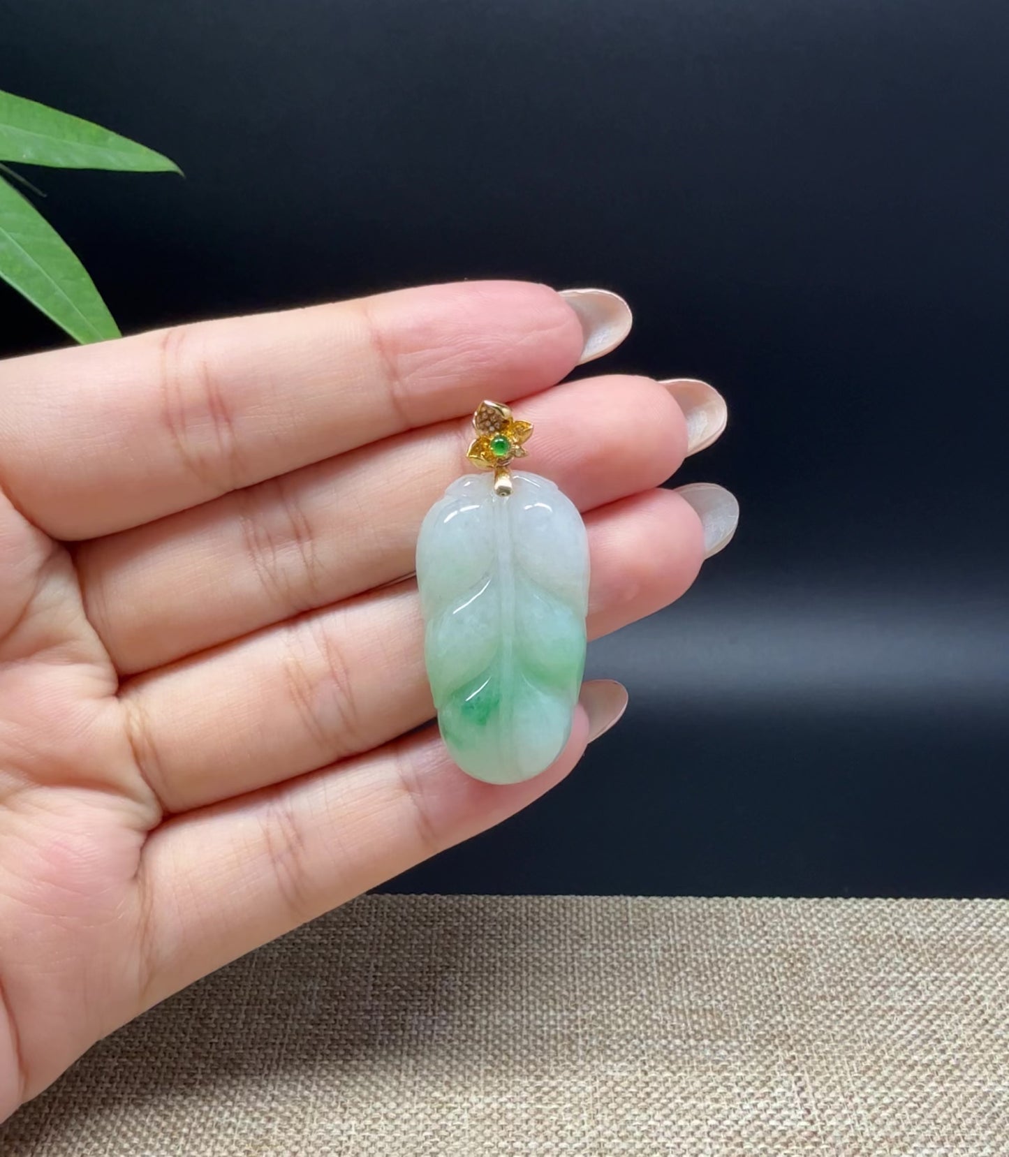 *Design concept--- This pendant is Made with genuine Burmese ice jadeite jade. Jin Zhi Yu Ye "Golden Branches & Jade Leaves" It's meaning someone is very precious as princess. This pendant looks very nice with ice jade. and add 18k yellow gold diamond bail with imperial jade. It's a very special gift for you and your loved ones.