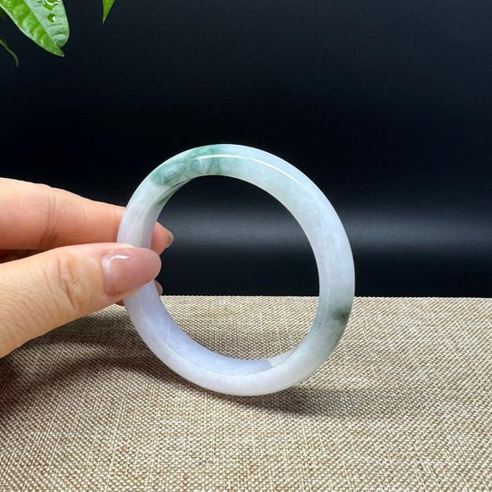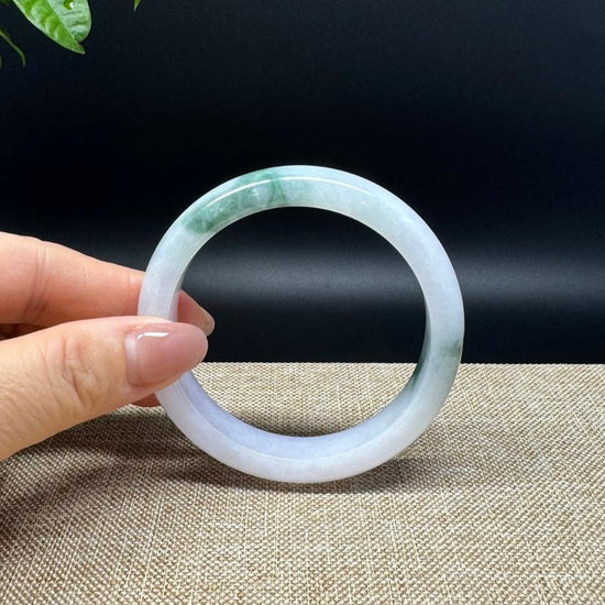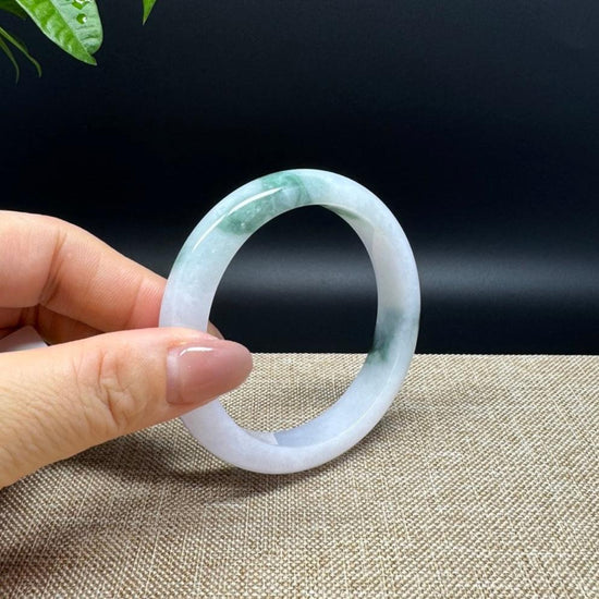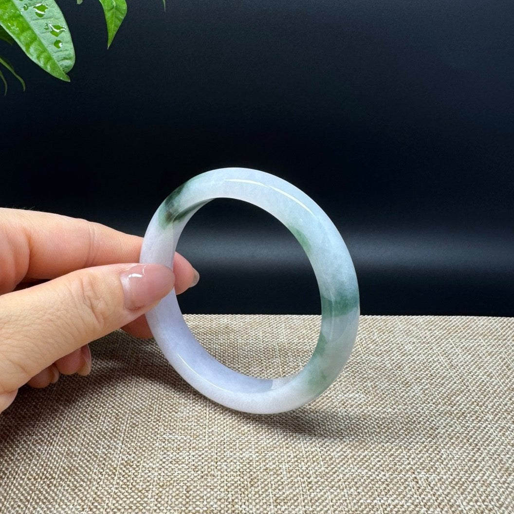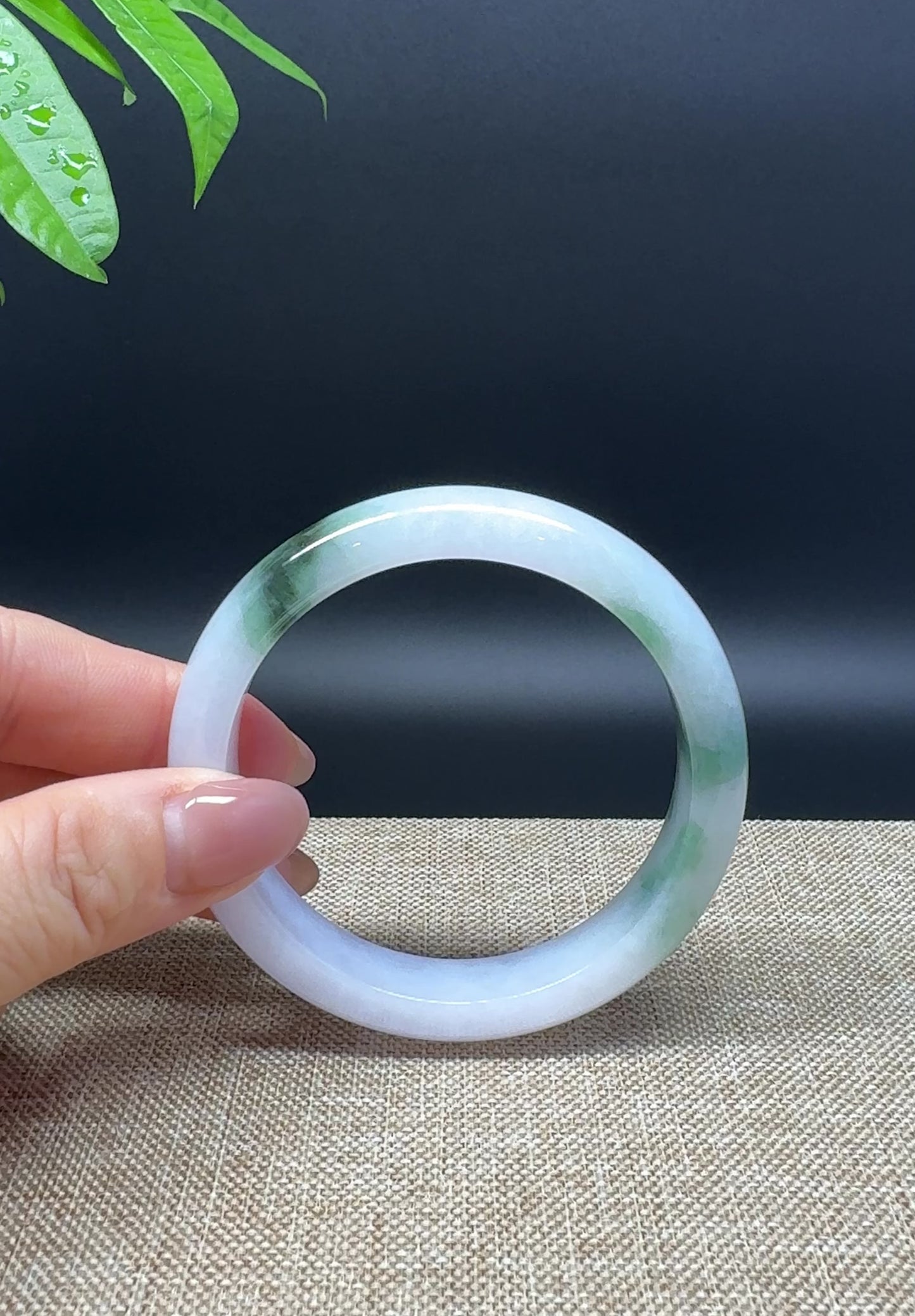 * DETAILS--- Genuine Burmese White Jadeite Jade Bangle Bracelet. This stunning bangle is made from premium Burmese jadeite, featuring lavender-white as the base with moss green flowers. Crafted in a classic half-round style, the bracelet exudes timeless elegance. Each piece is uniquely natural, making it a luxurious gift choice.