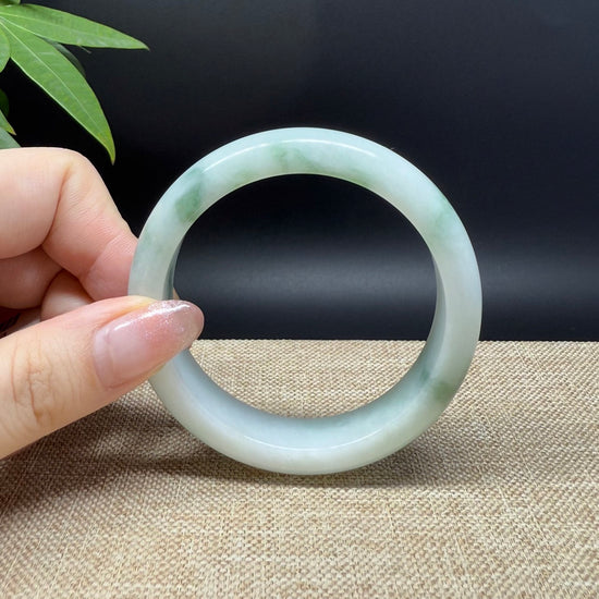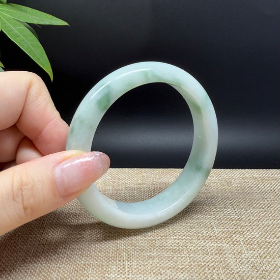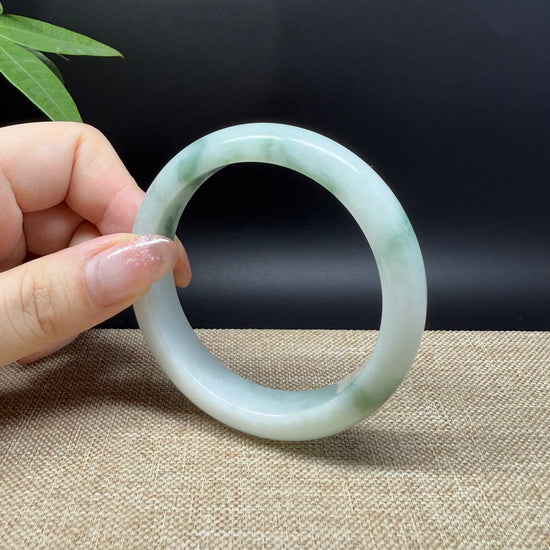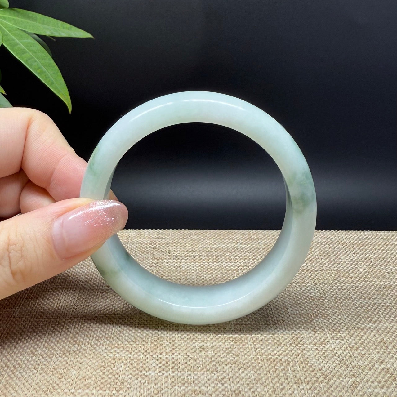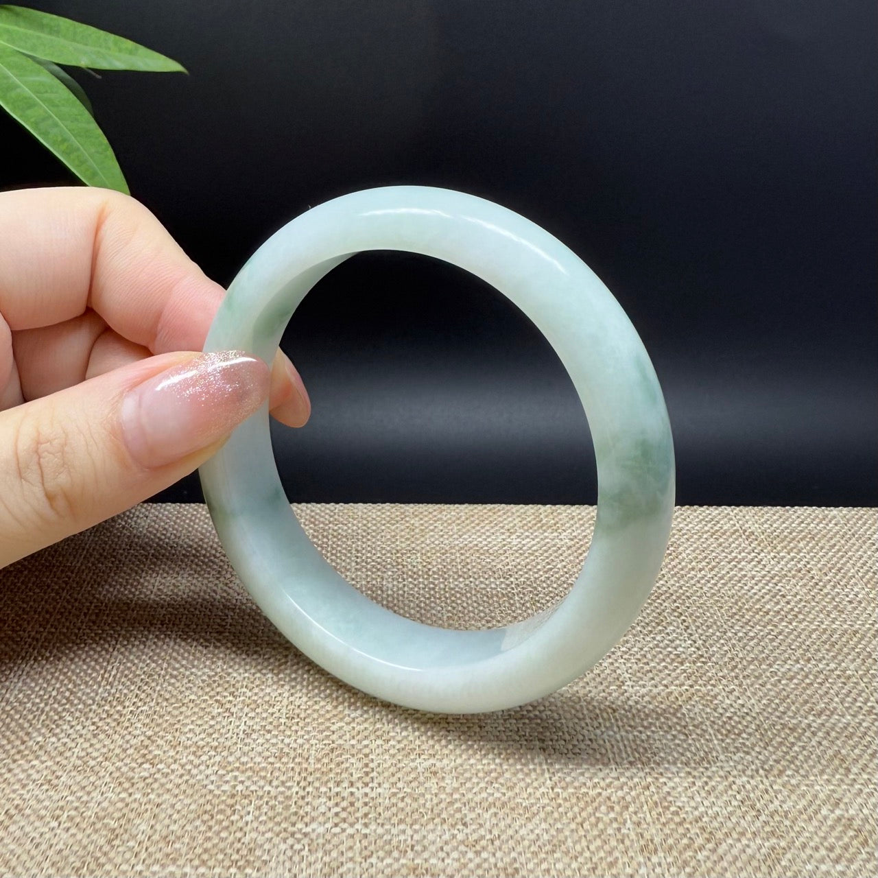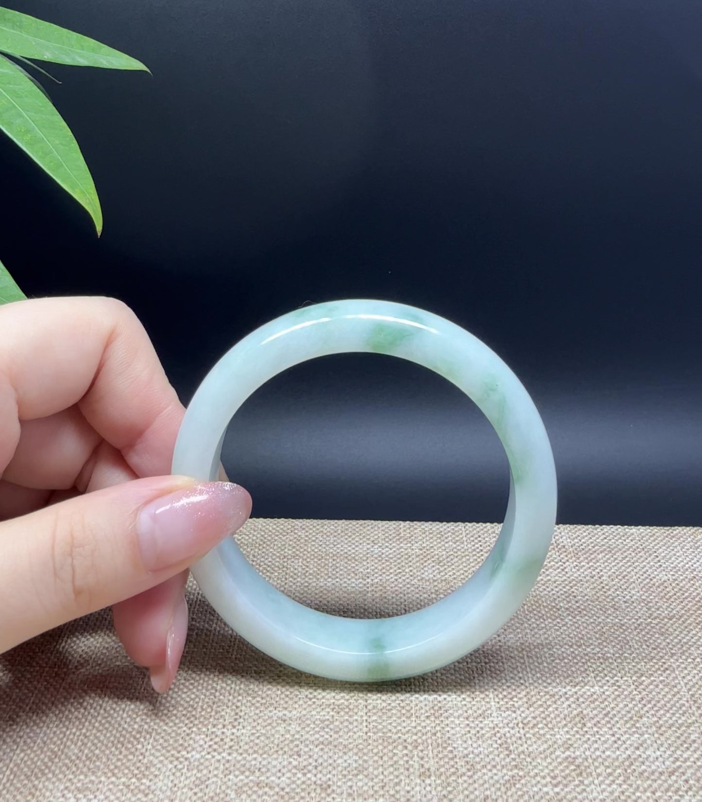 * DETAILS--- Genuine Burmese Jadeite Jade Bangle Bracelet. This Burmese jadeite bangle glows with ethereal milky white hues with matcha green flowers. Its smooth body flows like liquid silk in a perfect half-round embrace, capturing light with every graceful curve. A wearable sonnet where nature's pastel palette meets timeless craftsmanship - each glance reveals new depths of its poetic elegance.
