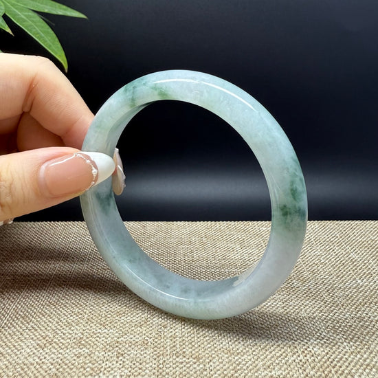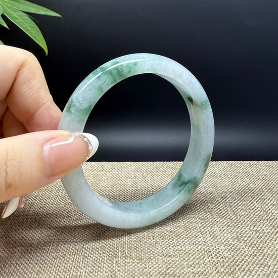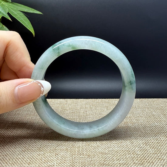 * DETAILS--- Genuine Burmese White Jadeite Jade Bangle Bracelet. This stunning bangle is made from fine Burmese jadeite, featuring milky white as the base with moss green flowers, just like mosses in snow. The half round shape offers both comfort and a perfect display of the jade’s natural beauty. A meaningful gift — perfect for yourself or someone truly special.