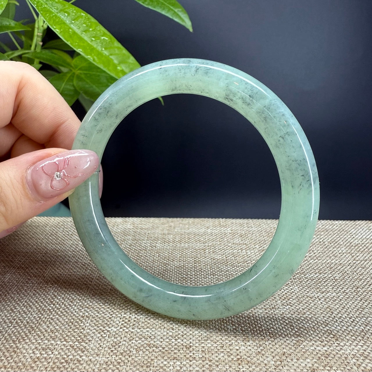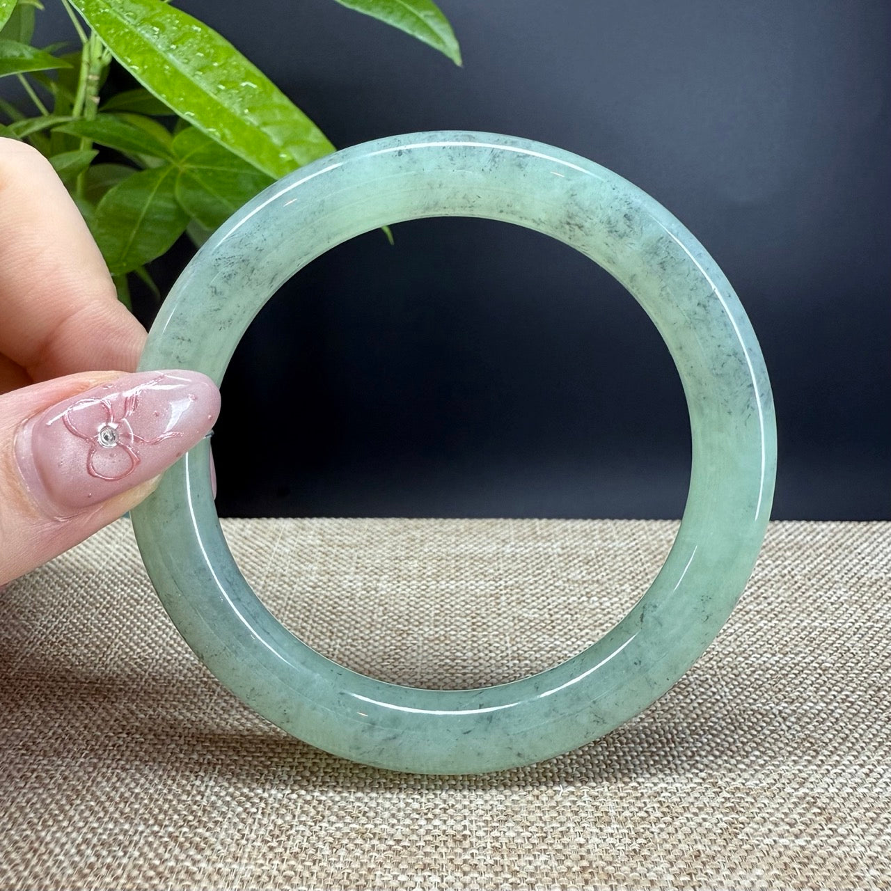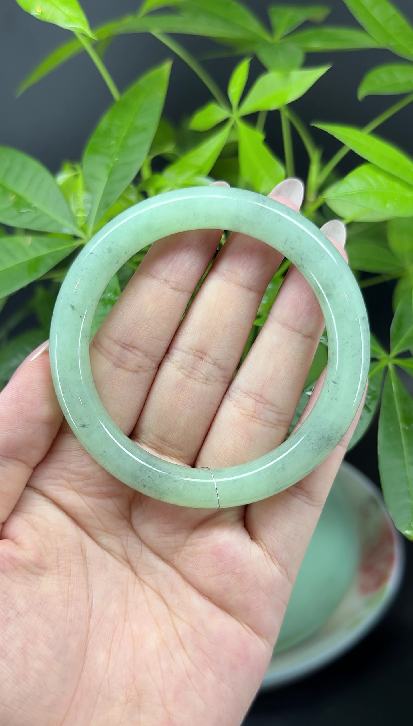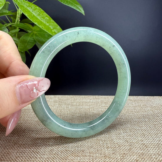 DETAILS--- Genuine Burmese Jadeite Jade Bangle Bracelet. This bangle is made with very high-quality genuine Burmese Jadeite jade. The jade texture is translucent and smooth with apple green base and some wuji(grey-black color) tone. The traditional round silhouette showcases nature's artistry in smooth, luxurious curves. It's a unique gift for you and your love.