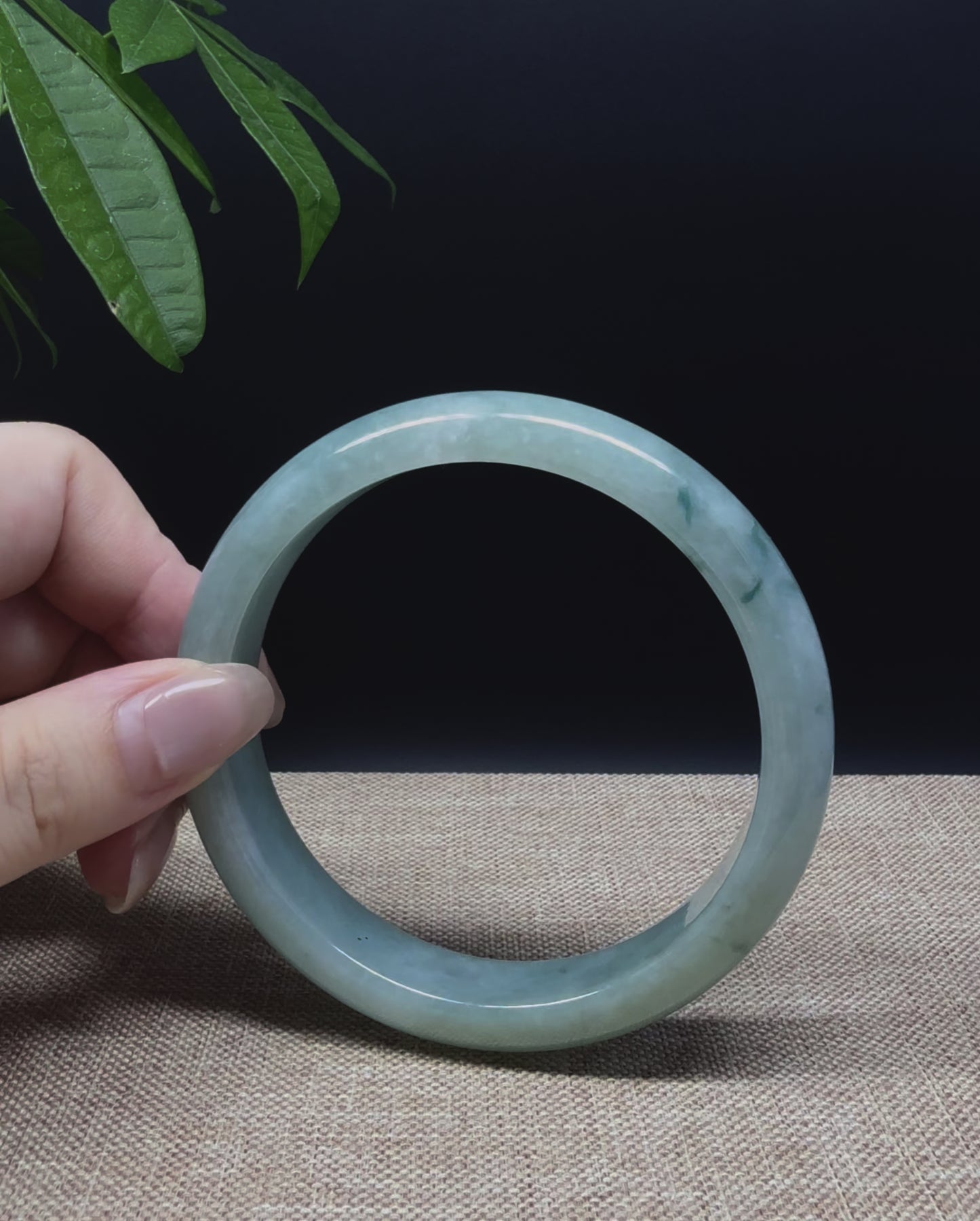 * DETAILS--- Genuine Burmese Jadeite Jade Bangle Bracelet. This bangle is made with very high-quality genuine Burmese Jadeite jade. The jade texture is fine and smooth with blue green color and a little oil green flowers. The half round shape offers both comfort and a perfect display of the jade’s natural beauty. This piece is naturally unique, radiating timeless beauty and cultural significance, making it a one-of-kind gift choice.