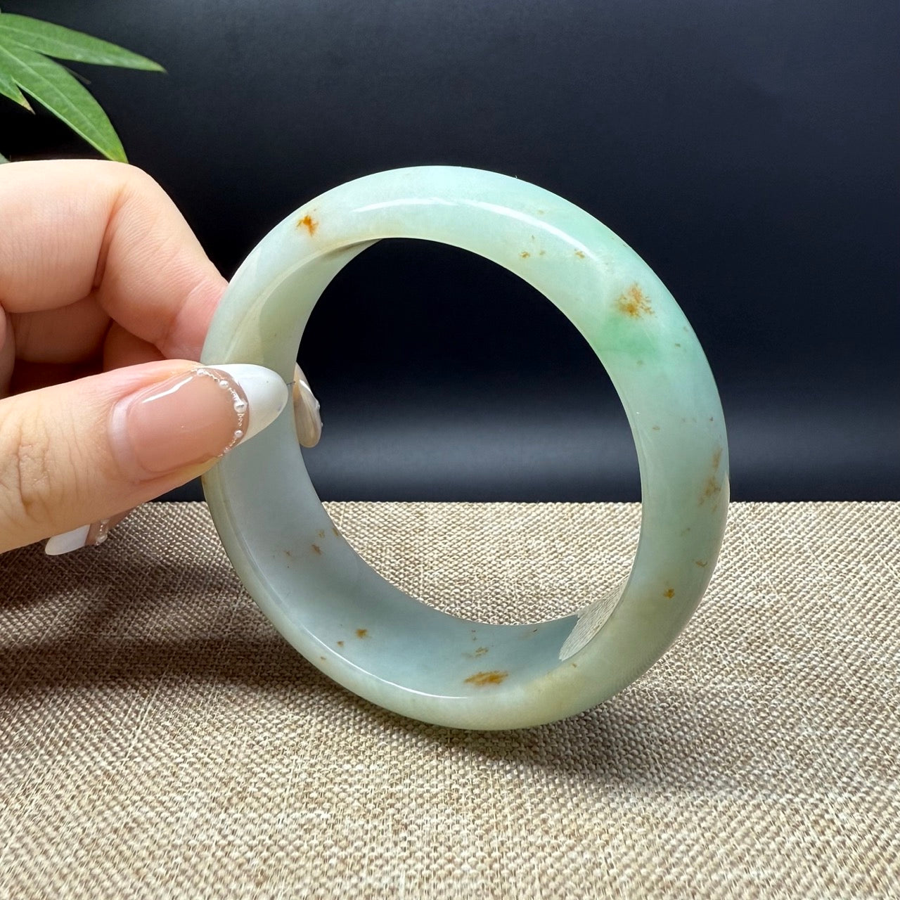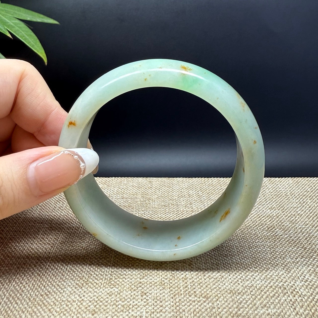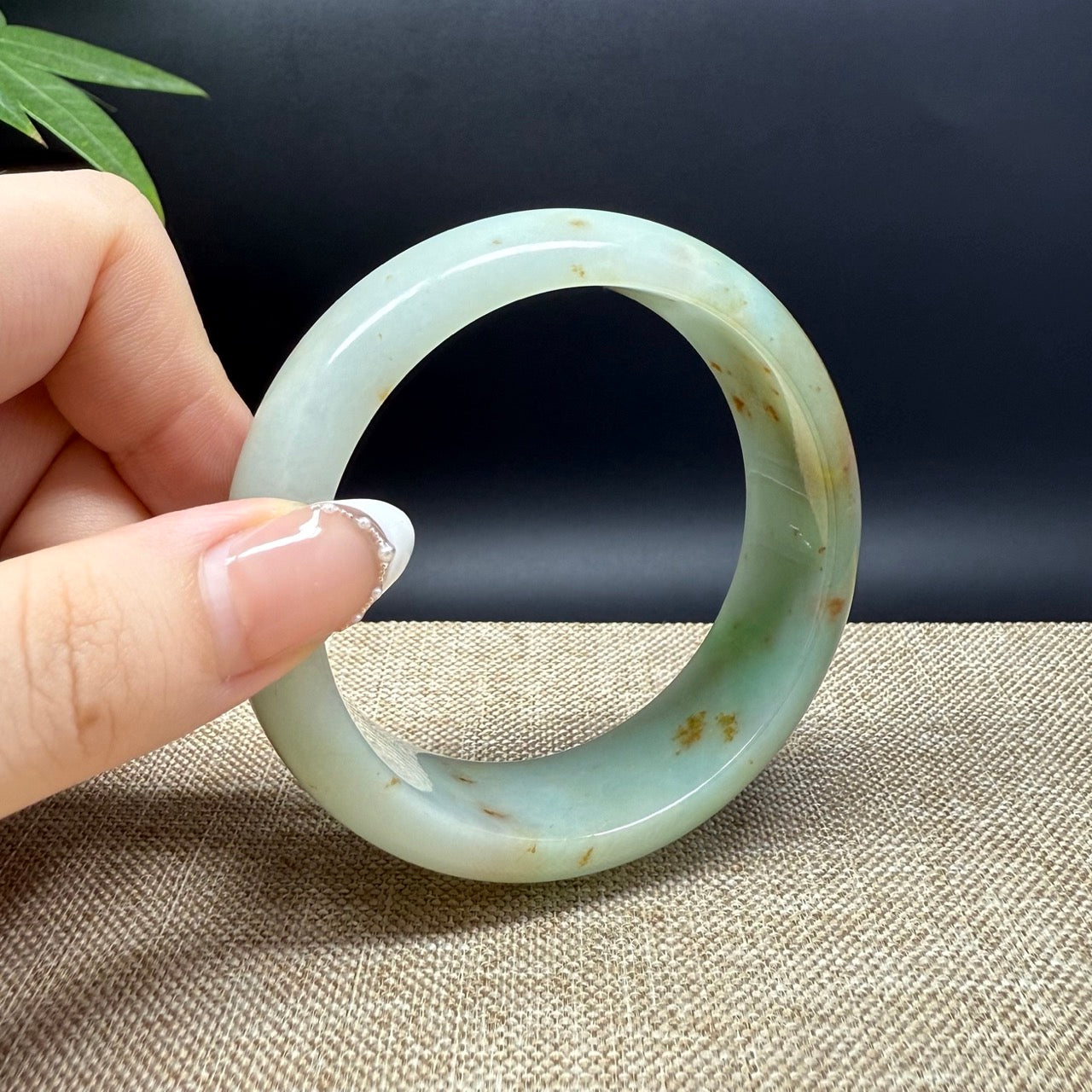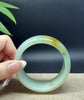 * DETAILS--- Genuine Burmese Jadeite Jade Bangle Bracelet. This bangle is made with very high-quality genuine Burmese Jadeite jade. The jade texture is fine and smooth with green base and some sajin(yellow/red flecks) and a yellow part. The half round shape offers both comfort and a perfect display of the jade’s natural beauty. More than just a piece of jewelry, this is a rare treasure—an elegant statement and a valuable investment in genuine Grade-A jadeite.