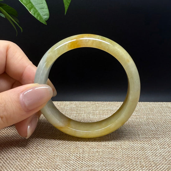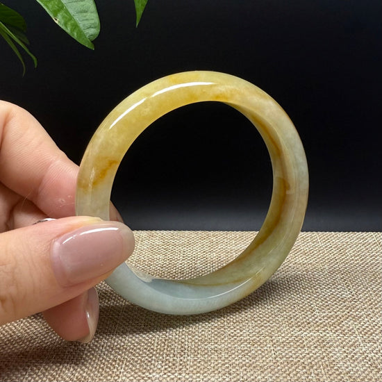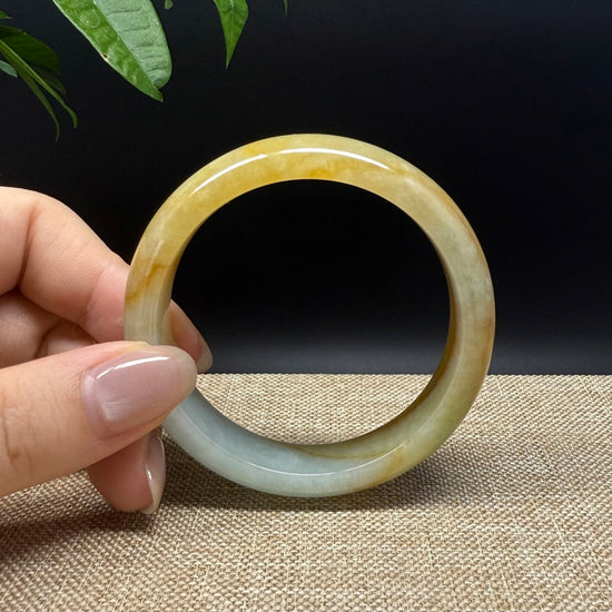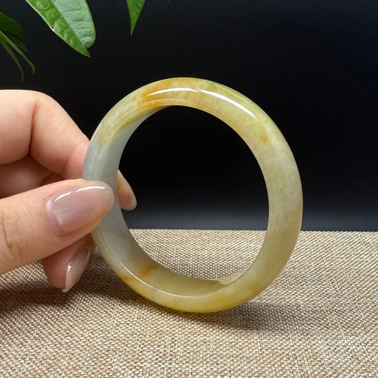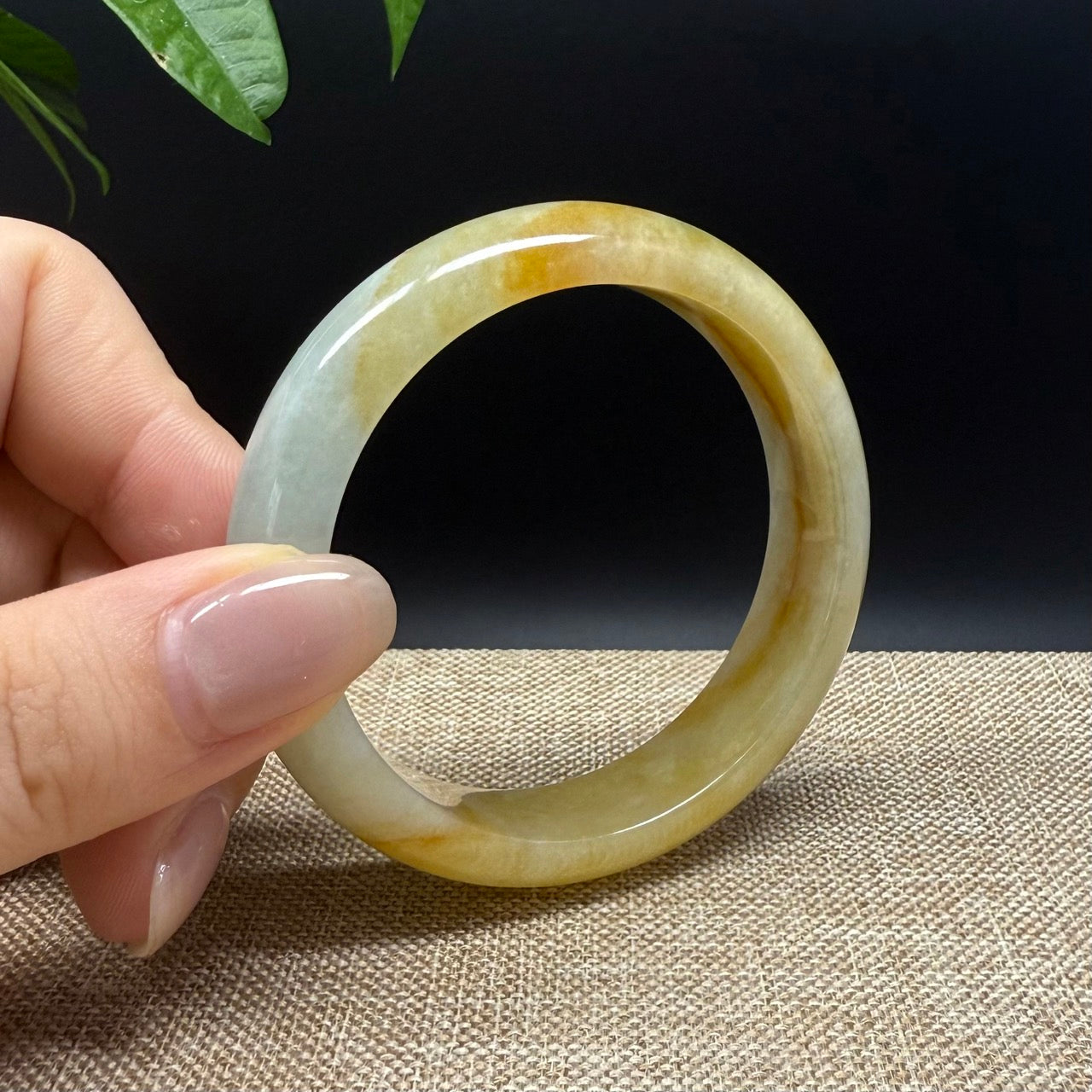 * DETAILS---Genuine Burmese Jadeite Jade Bangle Bracelet. This beautiful bangle is made from high-quality, natural Burmese yellow jadeite. It has a smooth texture and a stunning mix of colors—half tawny, half honey, with a touch of milky white.The classic half-round shape makes it timeless, and the unique colors make it truly stand out. It’s an elegant, eye-catching piece—perfect as a special gift for yourself or someone you love. It's a collectible item.
