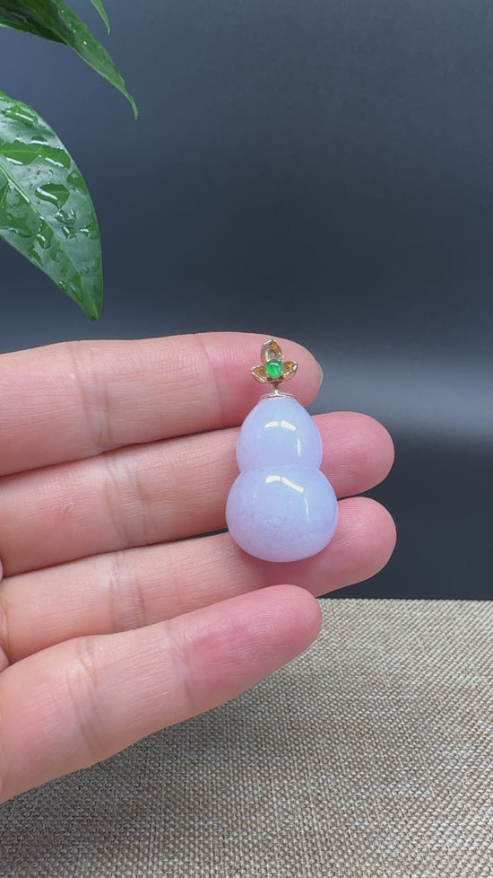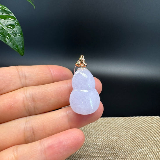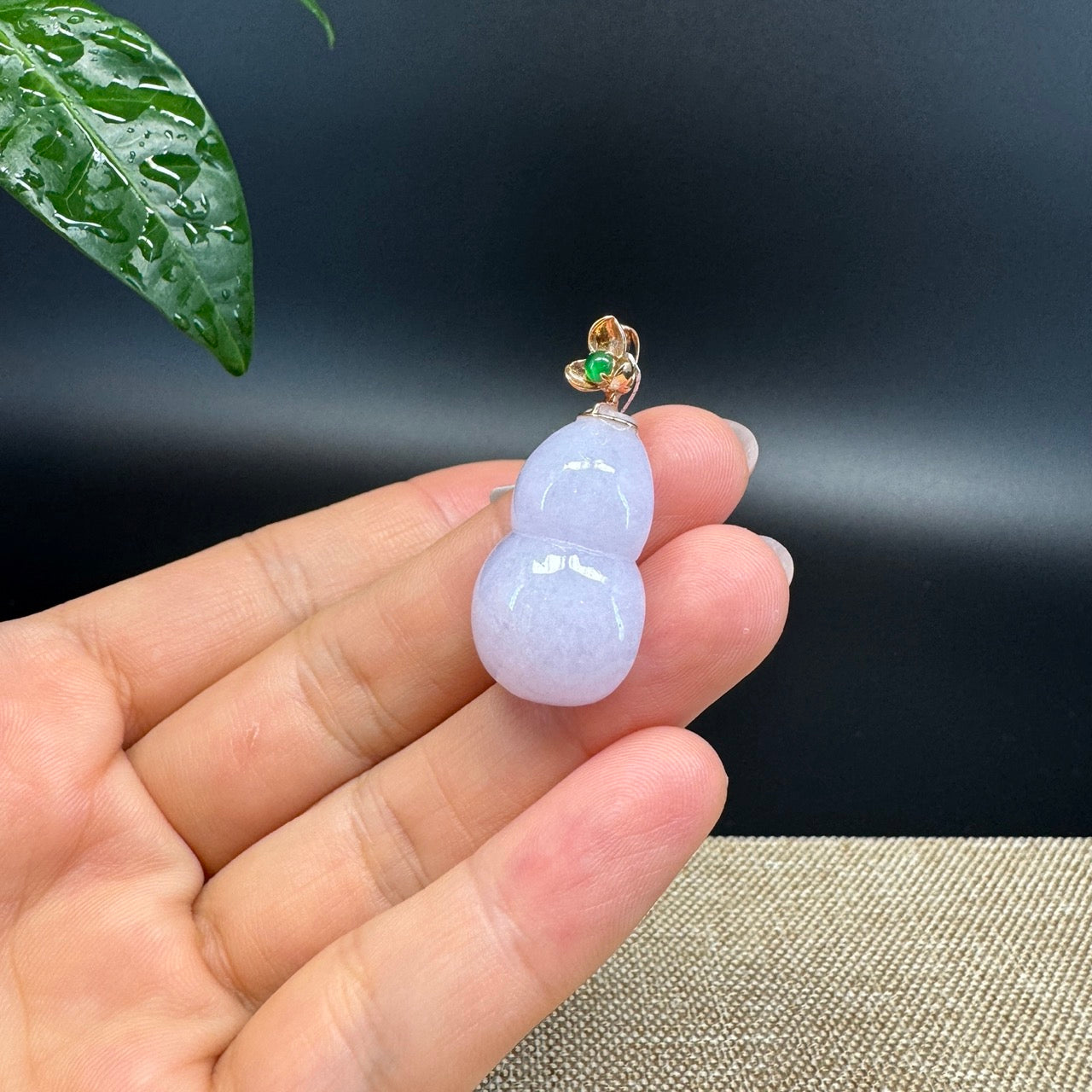 *Design concept-- Genuine lavender Jade fashioned into a section of Lucky HuLu as accent. This pendant is made with high-quality Burmese lavender jadeite jade. The jade texture is smooth with 18k rose gold imperial jade butterfly bail. Looks so cute! The pendant depicts a Magic HuLu to complete the picture. To represent wealth, health and good fortune. It's a special gift for yourself or your love.